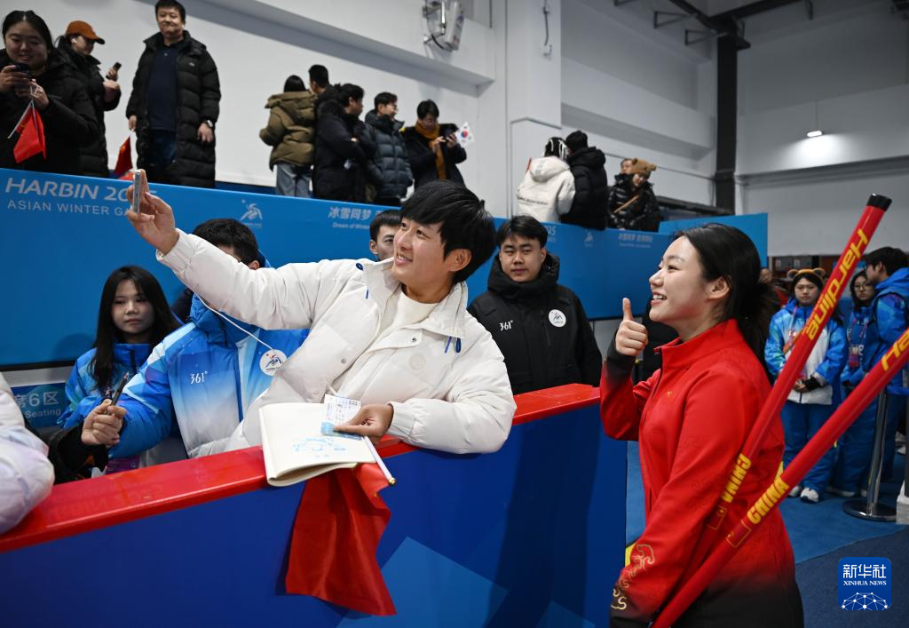 2月13日,中國隊選手韓雨(右)在比賽后和觀眾合影。