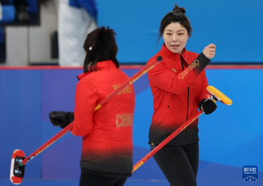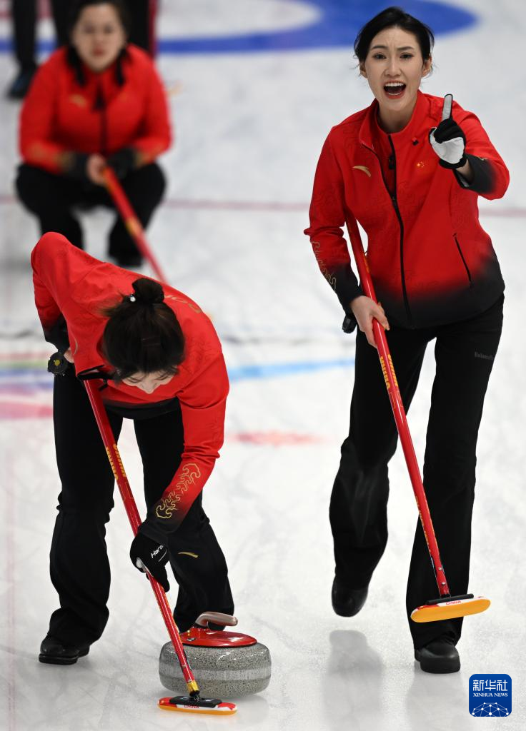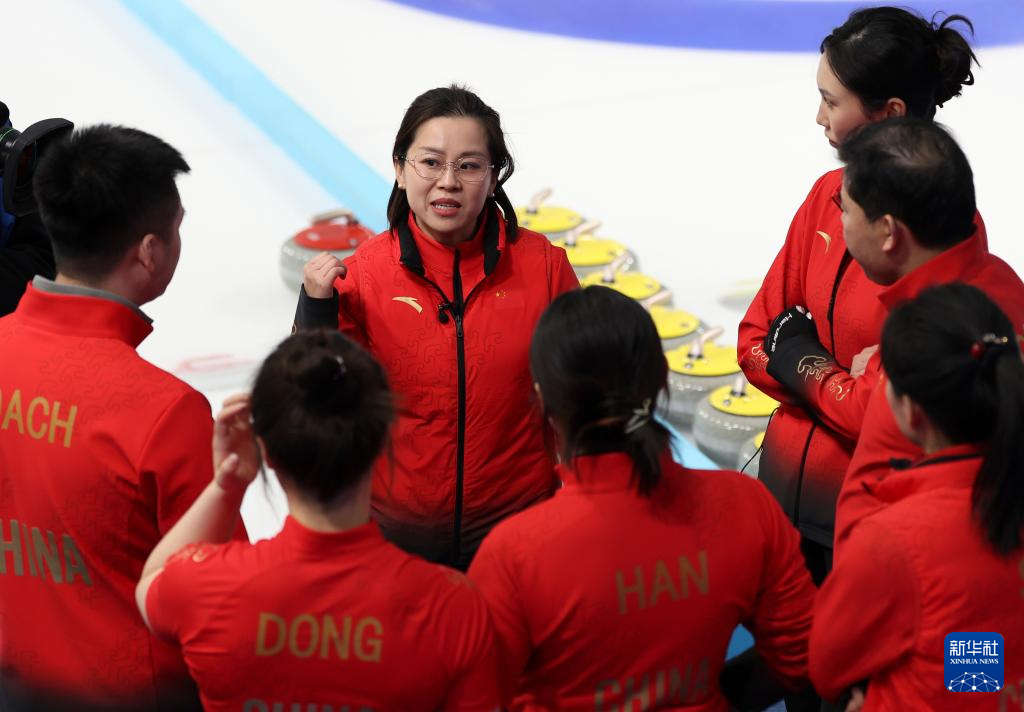 2月13日,中國隊選手王芮(右)在比賽中指揮隊友擦冰。