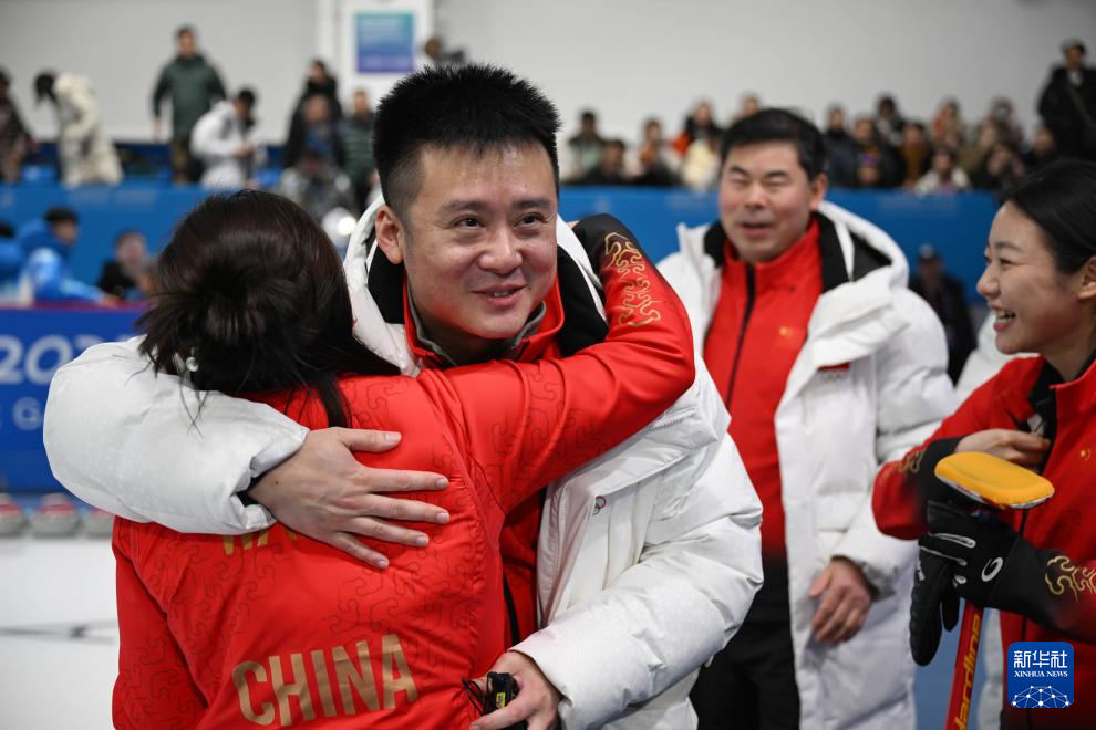 2月13日,中國隊教練臧嘉亮(左二)在比賽后與隊員王芮(左一)擁抱慶祝勝利。