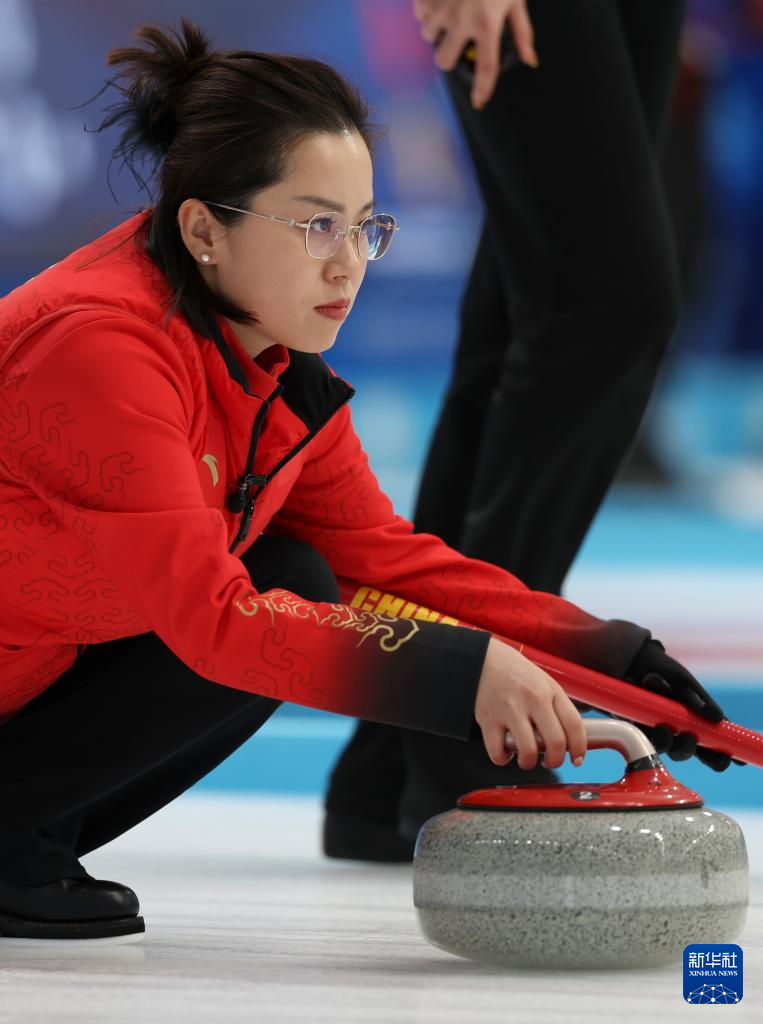 2月13日,中國隊選手王芮在比賽中擲壺。