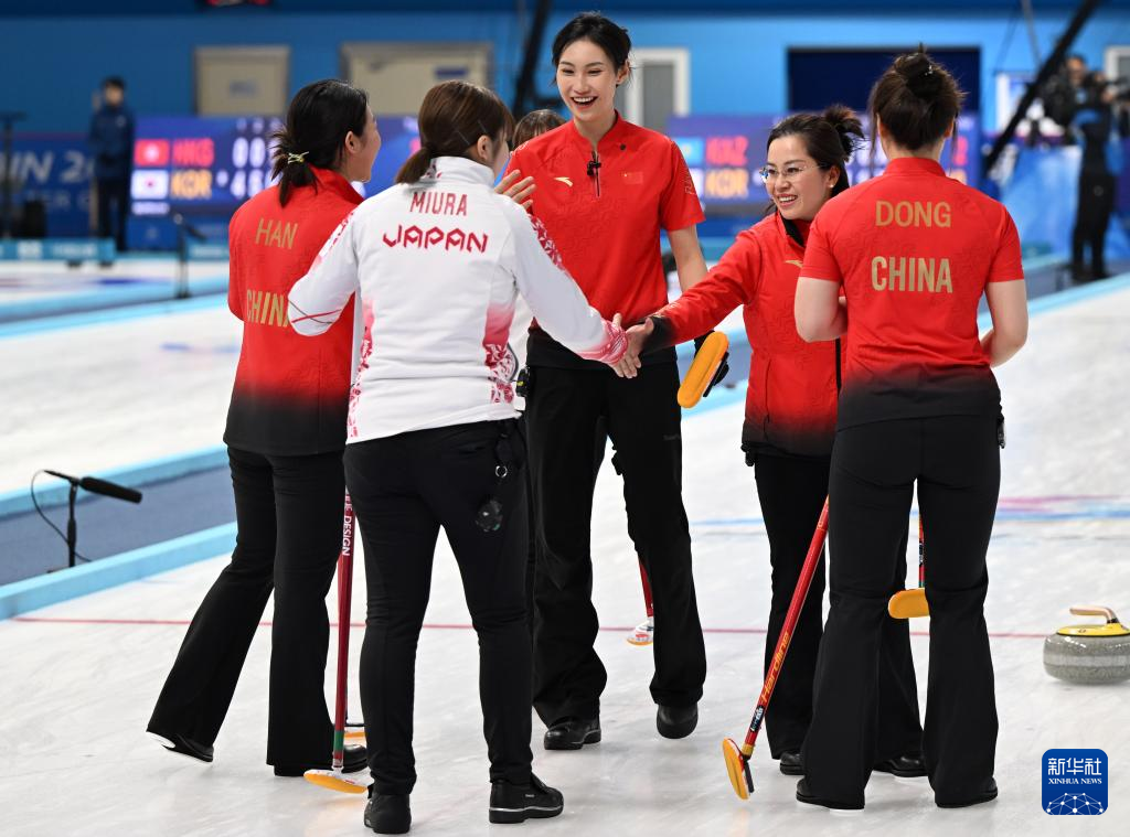 2月13日,中國隊選手王芮(右二)在比賽后和日本隊選手三浦由唯菜握手。