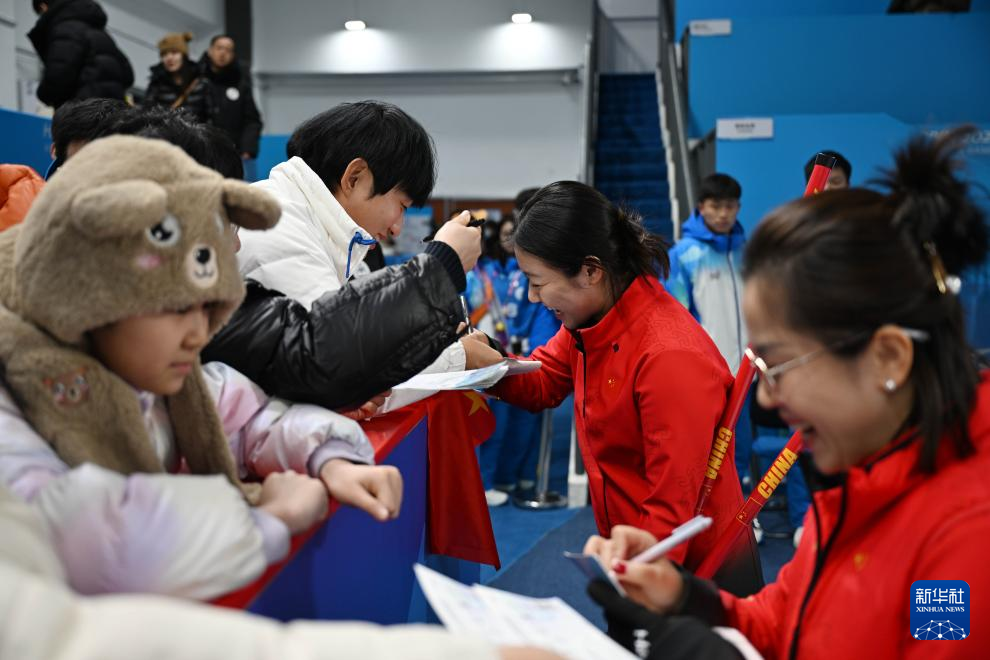 2月13日,中國隊選手韓雨(右二)、王芮(右一)在比賽后給觀眾簽名。
