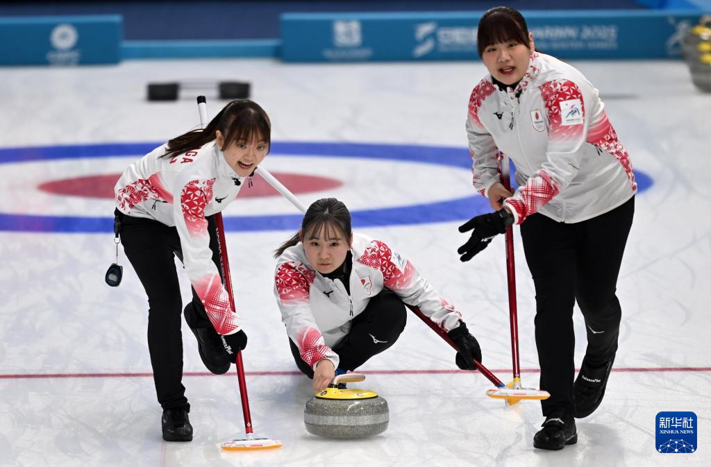 2月13日,日本隊選手安井涼音(中)在比賽中擲壺。