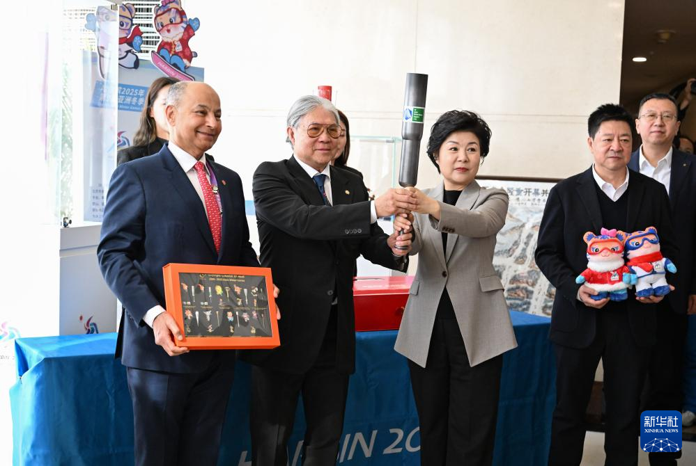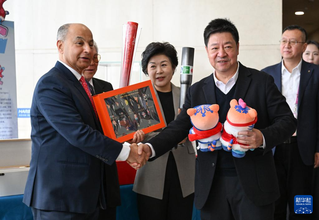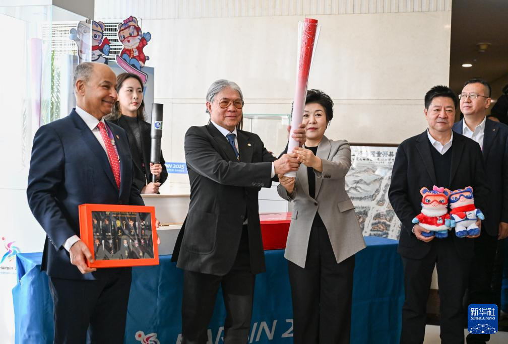 2月14日,亞奧理事會第一副主席霍震霆(左二)、亞奧理事會總干事阿爾穆薩拉姆(左一)向亞冬會執委會贈送第一屆到第八屆亞冬會火炬。
