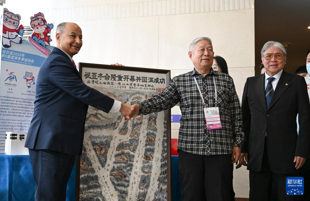 2月14日,畫家郭振禮(中)與亞奧理事會總干事阿爾穆薩拉姆(左)在其畫作前握手。郭振禮將自己歷時三個月創作的《獻禮亞冬會》贈送給亞奧理事會。