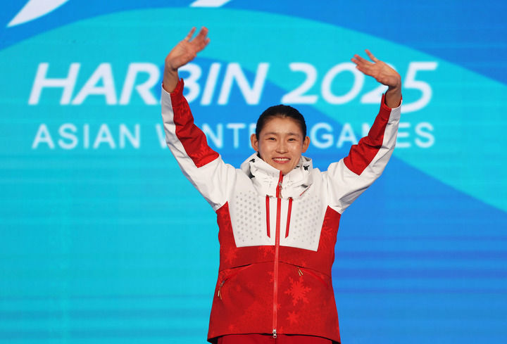 2025年2月8日,冠軍中國選手李磊在第九屆亞冬會越野滑雪女子個人短距離(傳統技術)頒獎儀式上。新華社記者 楊青 攝