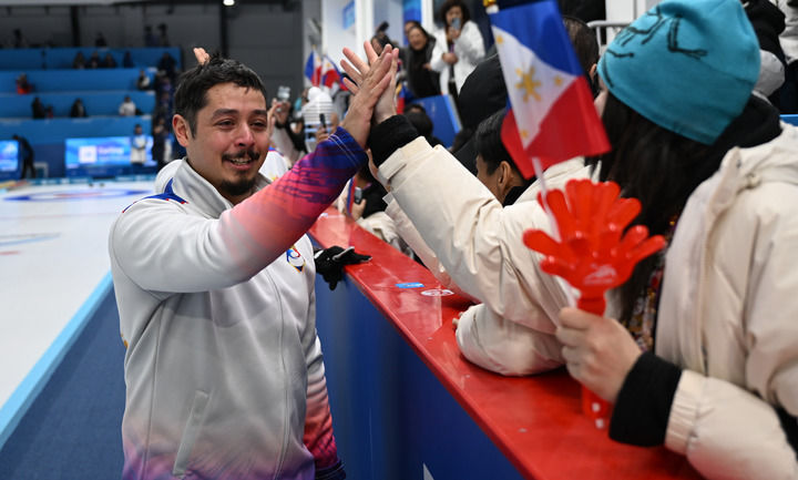 2025年2月14日,菲律賓隊選手馬克·安赫洛·普菲斯特在亞冬會男子冰壺金牌賽后慶祝。新華社記者 趙子碩 攝
