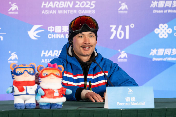 2025年2月11日,第九屆亞冬會自由式滑雪男子坡面障礙技巧賽后新聞發布會在亞布力舉行,這是季軍泰國選手保羅·亨利·維厄當在發布會現場。新華社記者 謝劍飛 攝