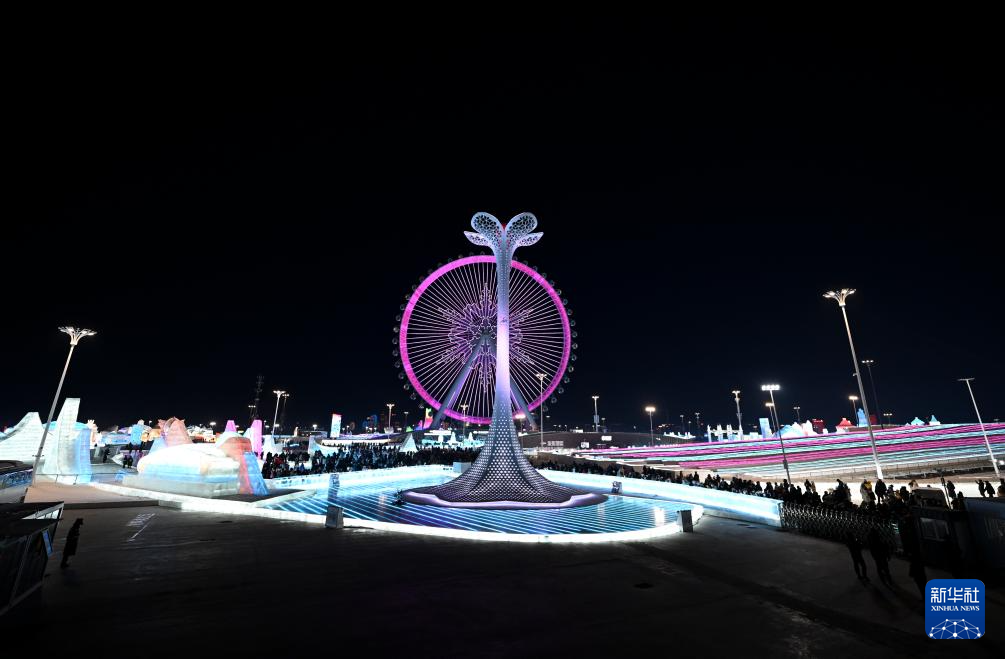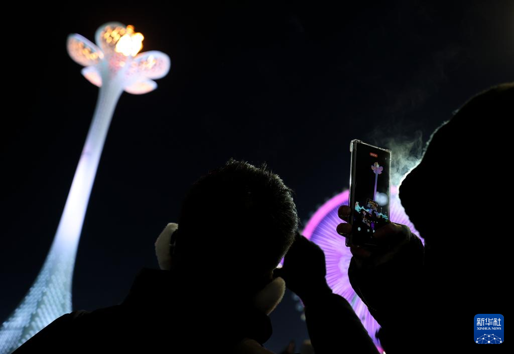 2月14日,觀眾在哈爾濱冰雪大世界拍攝亞冬會主火炬。