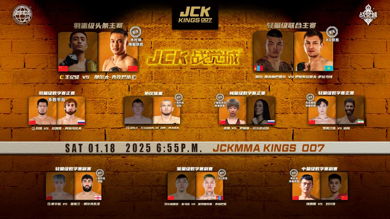 2025年1月18日,JCK戰覺城王者系列007戰罷,頭條主賽那爾太·克孜巴依木村鎖降服王紀征;聯合主賽伊斯布拉耶夫·薩拉馬特51秒KO圖拉·那木楠巴雅爾;正賽部分呂凱與拉姆贊·阿赫馬托夫戰成平局,科申·阿卡諾夫一致判定戰勝胡布蘭·吐爾遜別克、梁娜小腿肌肉切降服伊琳娜·切爾尼紹娃、羅周江措背后裸絞降服哈剛;副賽部分魯斯蘭·博爾克瓦澤一致判定戰勝常宇航、傲特根蘇榮·蘇赫巴圖TKO努爾加那提·朱馬依、錢騰園站立斷頭降服劉興奇。