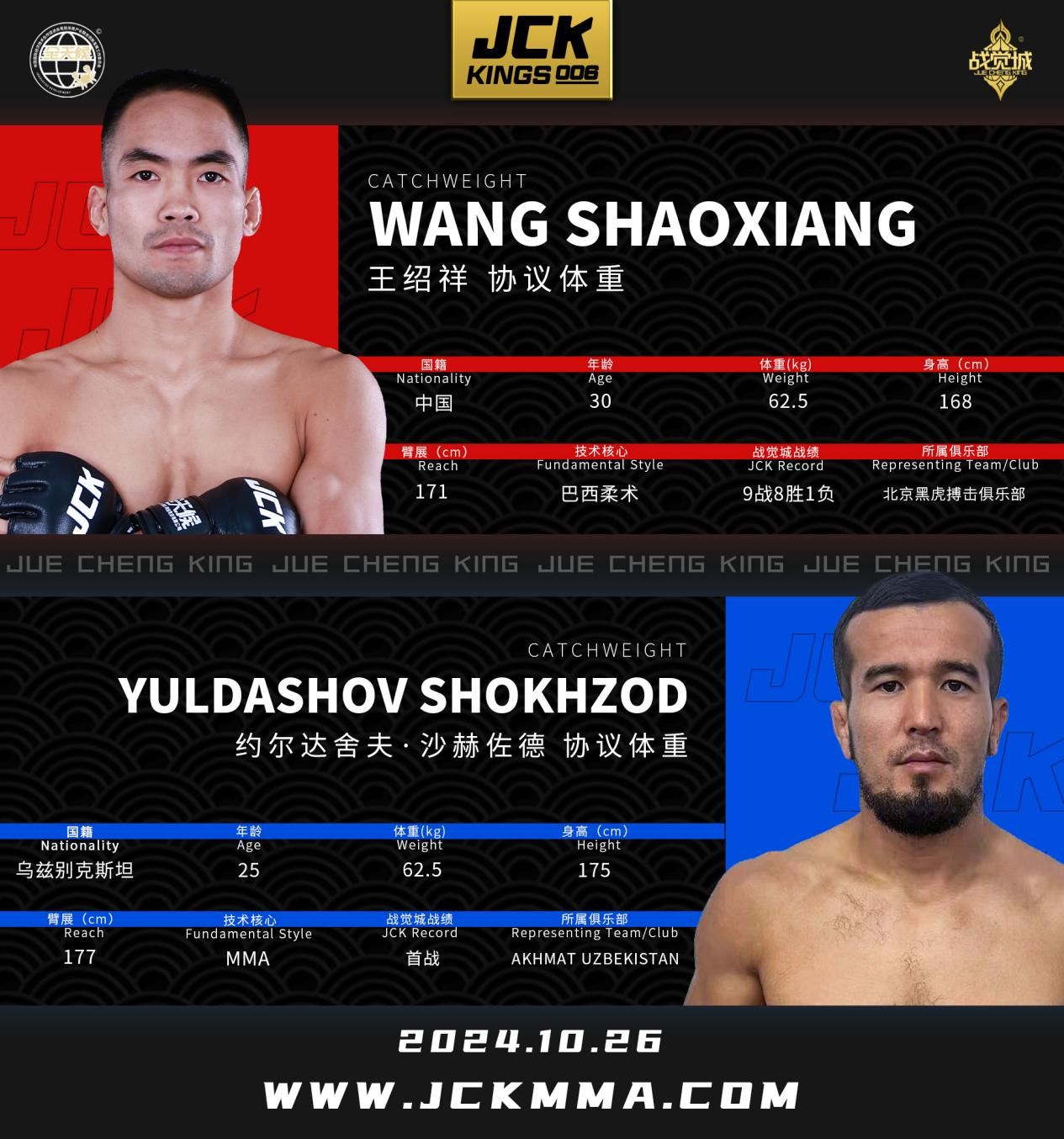 王紹祥,雛量級衛冕金腰帶,曾在JCK戰覺城創造八連勝紀錄,獲得“賞金之王”殊榮,是JCK戰覺城史上首條金腰帶獲得者,首位成功衛冕金腰帶的“王者”。約爾達舍夫·沙赫佐德,是來自烏茲別克斯坦的金腰帶選手,同時是摔跤與散打領域的雙料冠軍,職業生涯9勝2負。