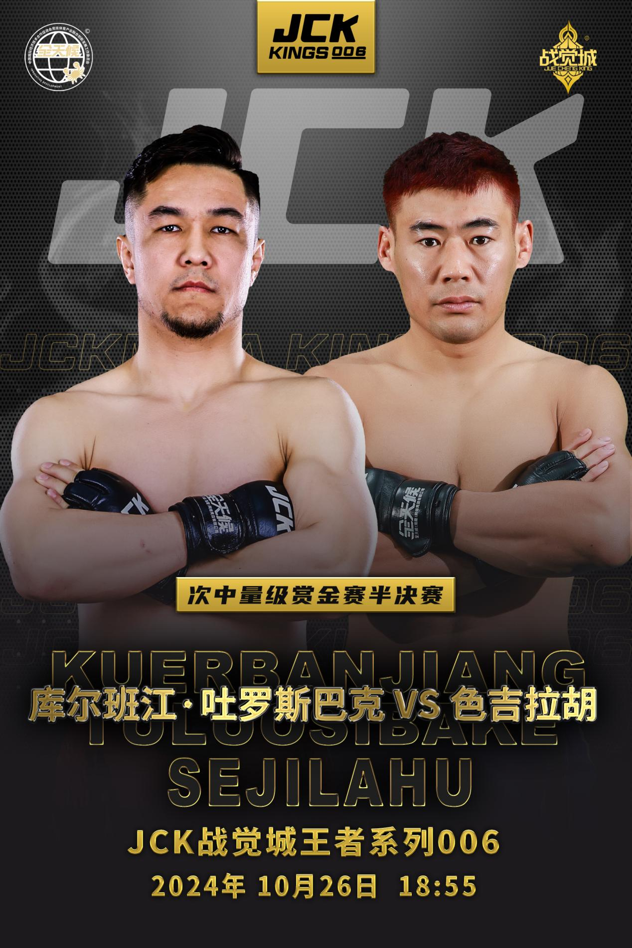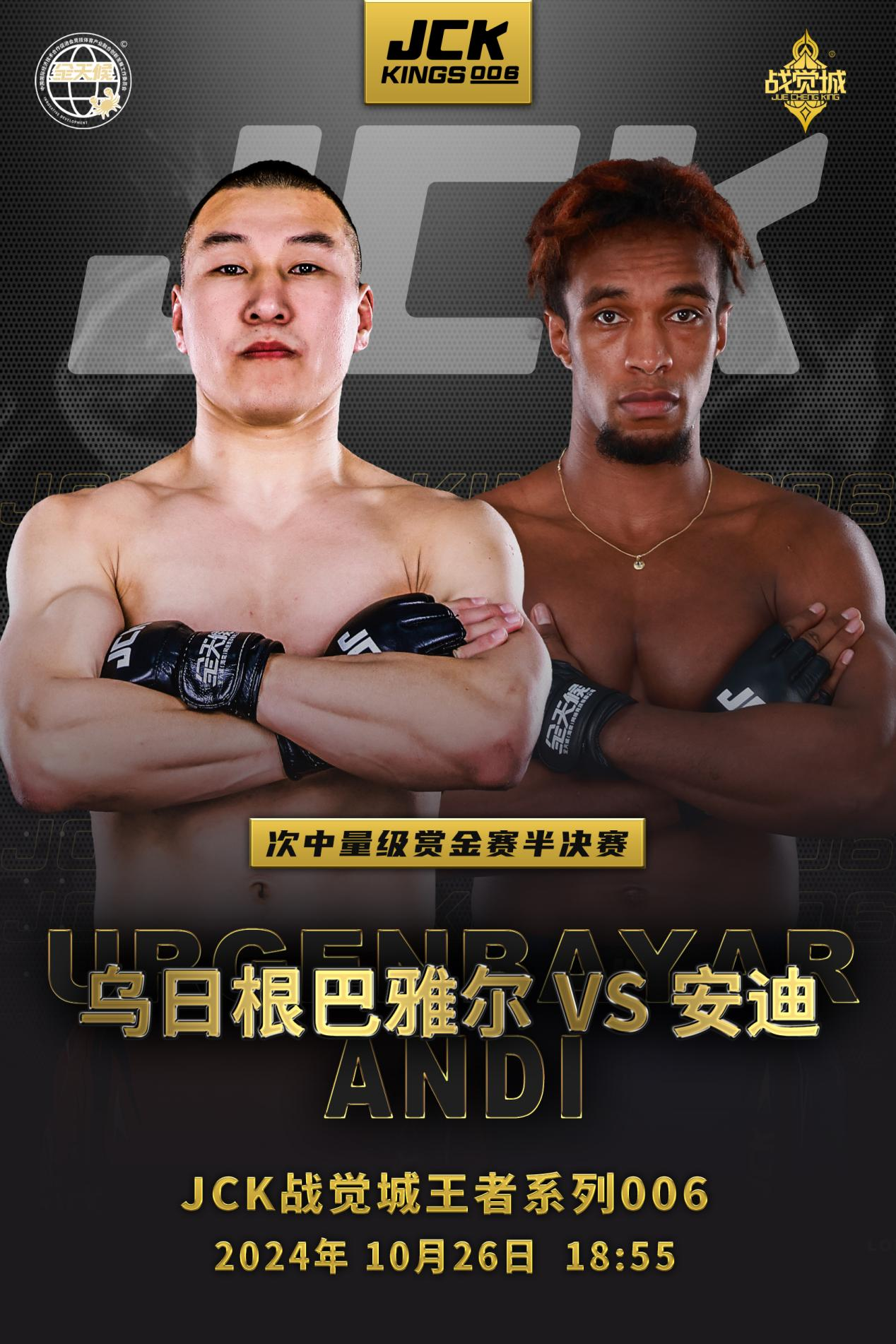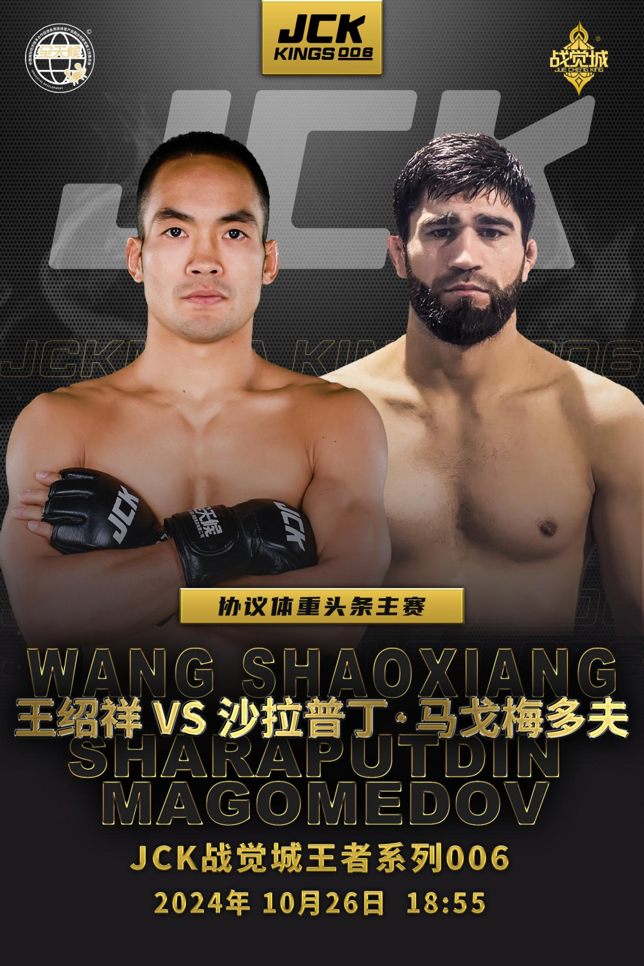 10月26日,JCK戰覺城王者系列006將在JCK戰覺城國際格斗中心上演,雛量級衛冕金腰帶王紹祥迎戰俄羅斯格斗聯盟冠軍沙拉普丁·馬戈梅多夫。與此同時,次中量級賞金賽半決賽也將拉開序幕,庫爾班江·吐羅斯巴克迎戰色吉拉胡,烏日根巴雅爾將與安迪展開對決。