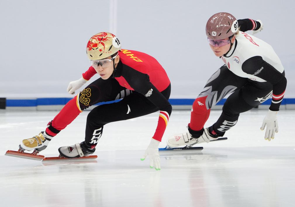 2024年12月8日,中國選手范可新(左)在國際滑聯短道速滑世界巡回賽北京站混合團體接力A組決賽中。