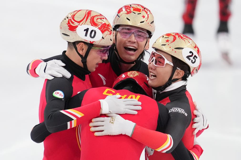 2024年12月8日,中國隊選手劉少昂(左)、劉少林(后)、李文龍(右)和孫龍在國際滑聯短道速滑世界巡回賽北京站男子5000米接力決賽后慶祝。