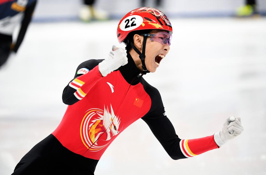 2024年12月7日,中國選手孫龍在國際滑聯短道速滑世界巡回賽北京站男子500米A組決賽后慶祝。