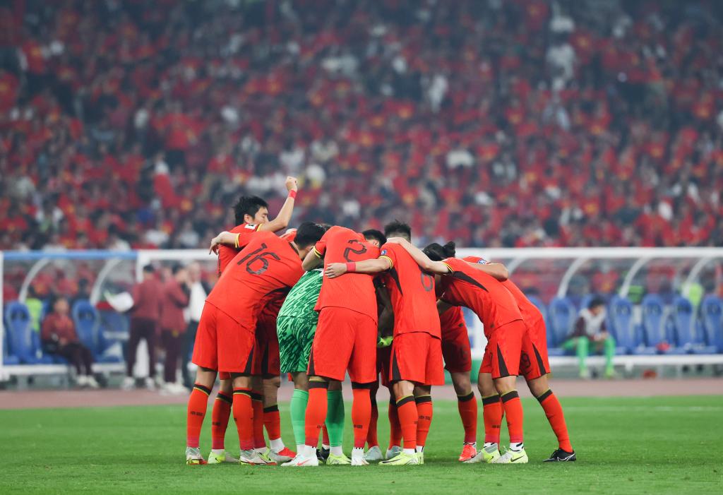 3月25日,中國隊球員在2026年美加墨世界杯亞洲區預選賽18強賽C組第八輪比賽下半場開始前加油鼓勁。新華社記者 張晨 攝