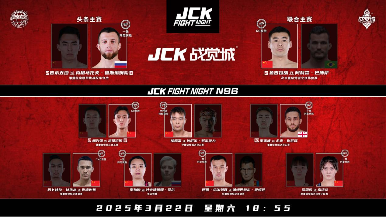 2025年3月22日,JCK覺城之夜N96落下戰幕,頭條主賽內格馬托夫·魯斯塔姆松一致判定戰勝吉木五沙,拿到金腰帶挑戰權;聯合主賽色吉拉胡KO阿利森·巴博薩;正賽部分求基倫周53秒KO楊興強、胡耀宗木村鎖降服達尼爾·努爾波力、格魯吉亞選手戈查·謝尼澤捍衛職業生涯7戰不??;男子副賽連渣也布TKO阿卜杜拉·達依木、阿曼·烏爾列吾一致判定戰勝蒙古國選手;女子副賽李怡璇斬獲5連勝、高浣珺戰勝閆雨欣。