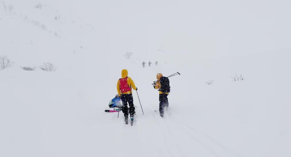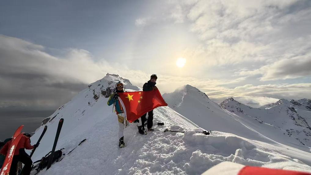 李銘(左)、王凱翔(右)在挪威羅弗敦群島進行滑雪登山訓練時展示五星紅旗。圖片來自李銘