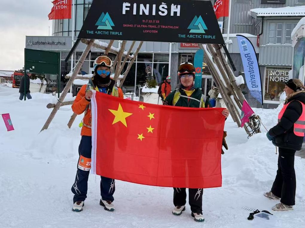 李銘(左)和王凱翔(右)在完成2025挪威羅弗敦滑雪登山賽后展示五星紅旗。圖片來自李銘