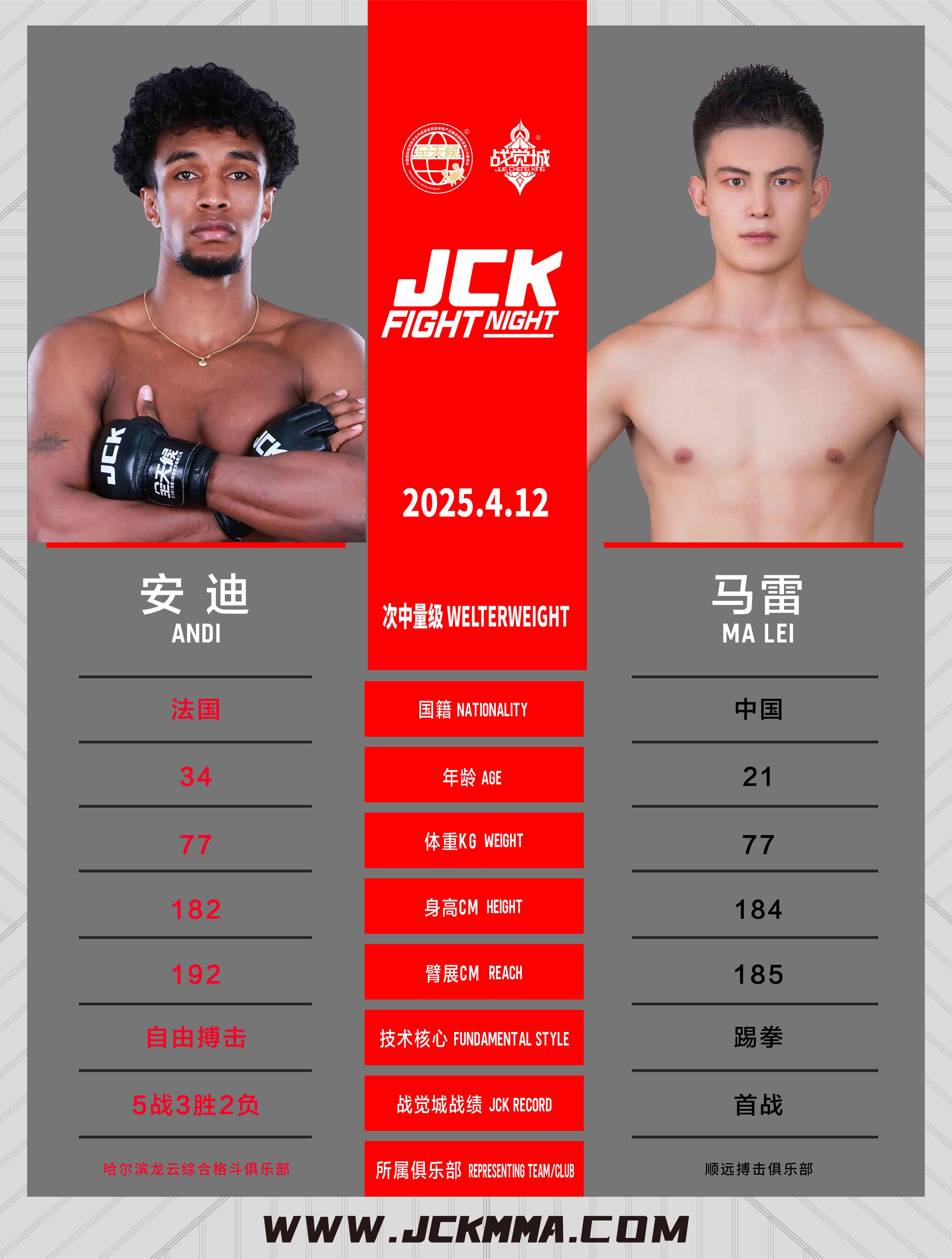 馬雷,年齡21歲,技術核心:踢拳,本場是他綜合格斗職業生涯的首秀,亦是JCK戰覺城首戰。