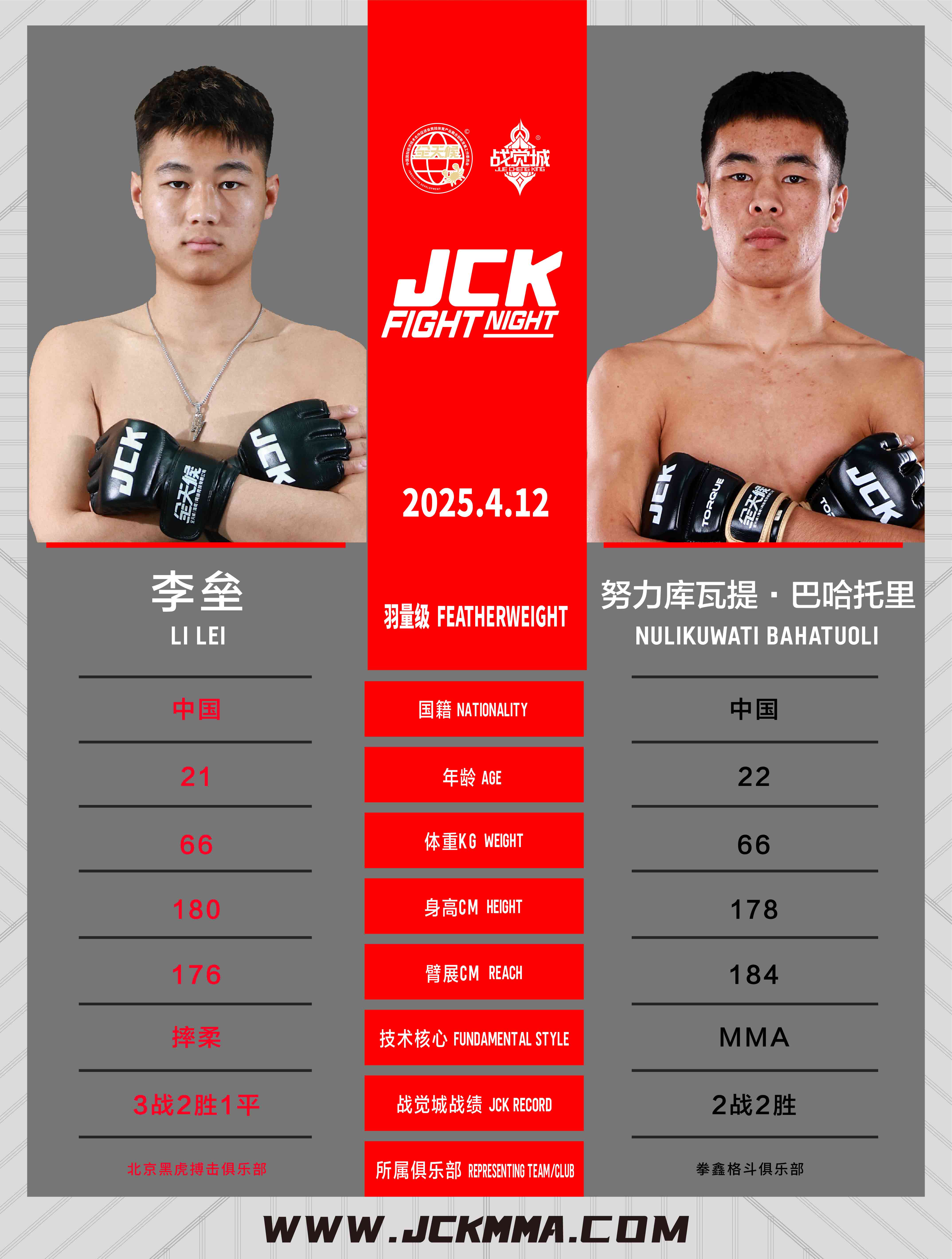 李壘,年齡21歲,技術核心:摔柔,在JCK戰覺城3戰2勝1平,曾一致判定戰勝艾力帕提·帕力塔洪、首回合背后裸絞降服扎恩哈爾·奴爾木哈買提,與印度冠軍選手雷漢·盧拉三回合戰平。