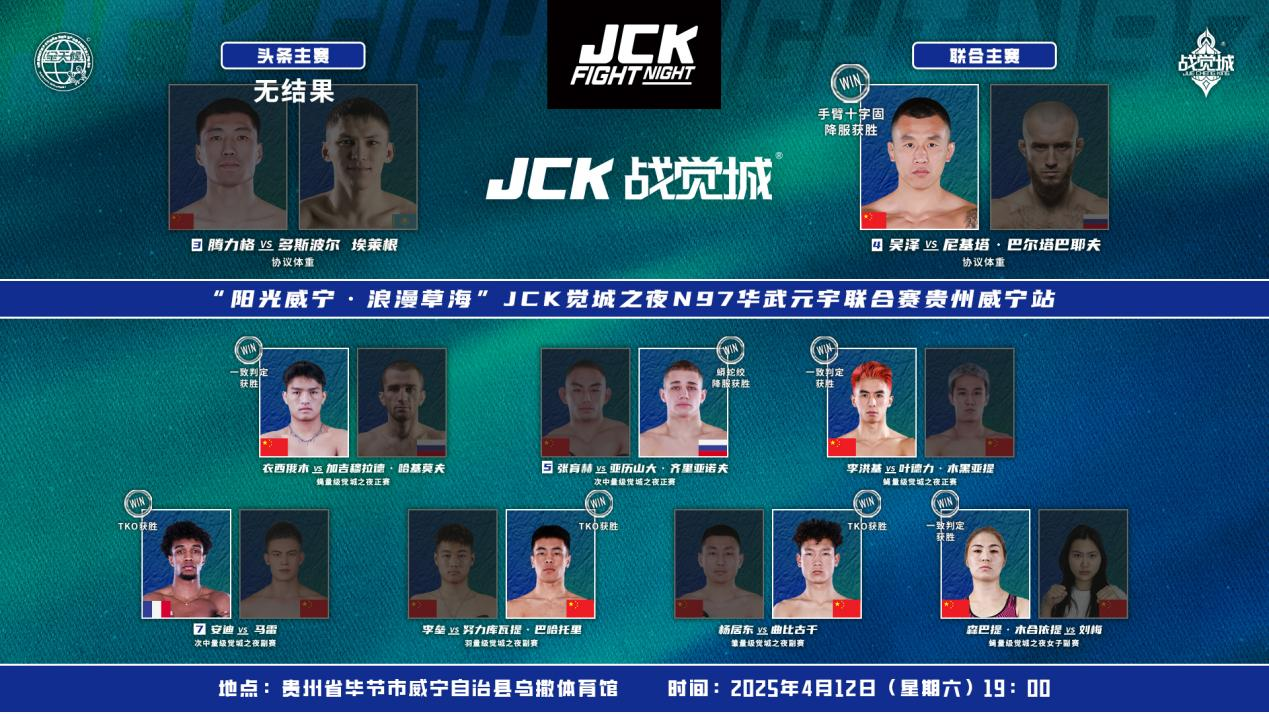 2025年4月12日,“陽光威寧·浪漫草?!盝CK覺城之夜N97華武元宇聯合賽貴州威寧站戰罷,頭條主賽騰力格VS多斯波爾 埃萊根,無結果;聯合主賽吳澤手臂十字固降服尼基塔·巴爾塔巴耶夫;正賽加吉穆拉德·哈基莫夫賽前超重,未能終結對手,衣西俄木獲勝,亞歷山大·齊里亞諾夫蟒蛇絞降服張育赫,李洪基一致判定戰勝葉德力·木黑亞提;男子副賽安迪、努力庫瓦提·巴哈托里、曲比古千均TKO取勝;女子副賽森巴提·木合依提一致判定戰勝劉梅。