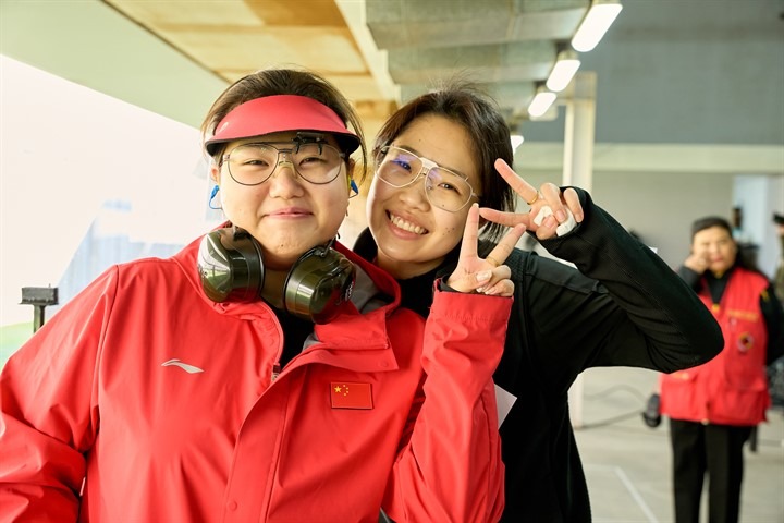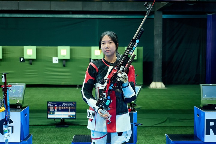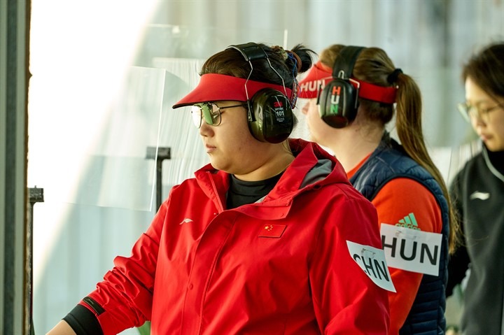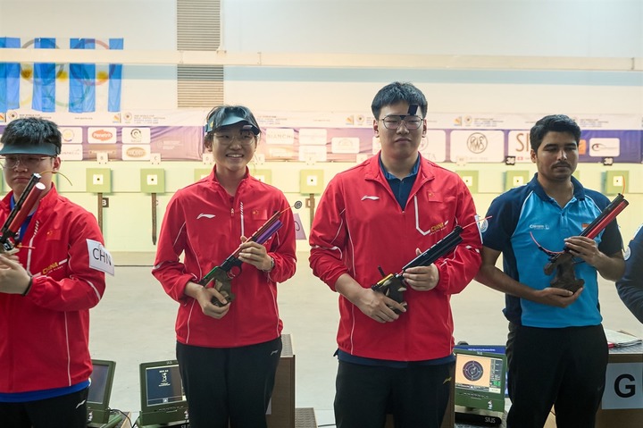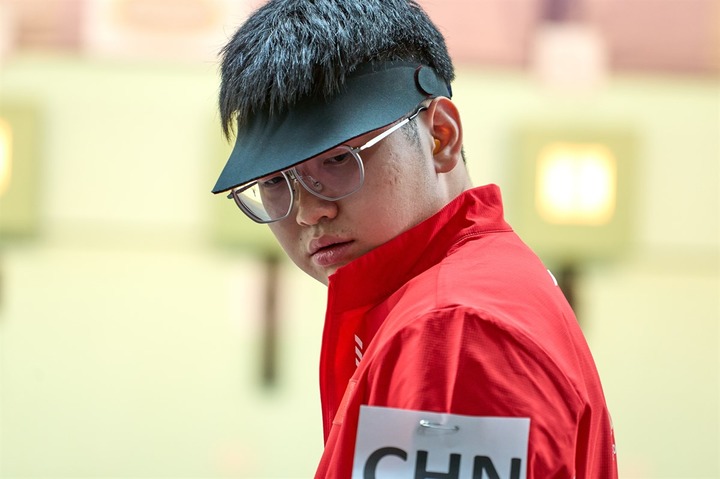 2024年7月27日,在法國沙托魯舉行的巴黎奧運會射擊10米氣步槍混合團體決賽中,中國選手黃雨婷/盛李豪奪冠,贏得巴黎奧運會首枚金牌。新華社記者 鞠煥宗 攝