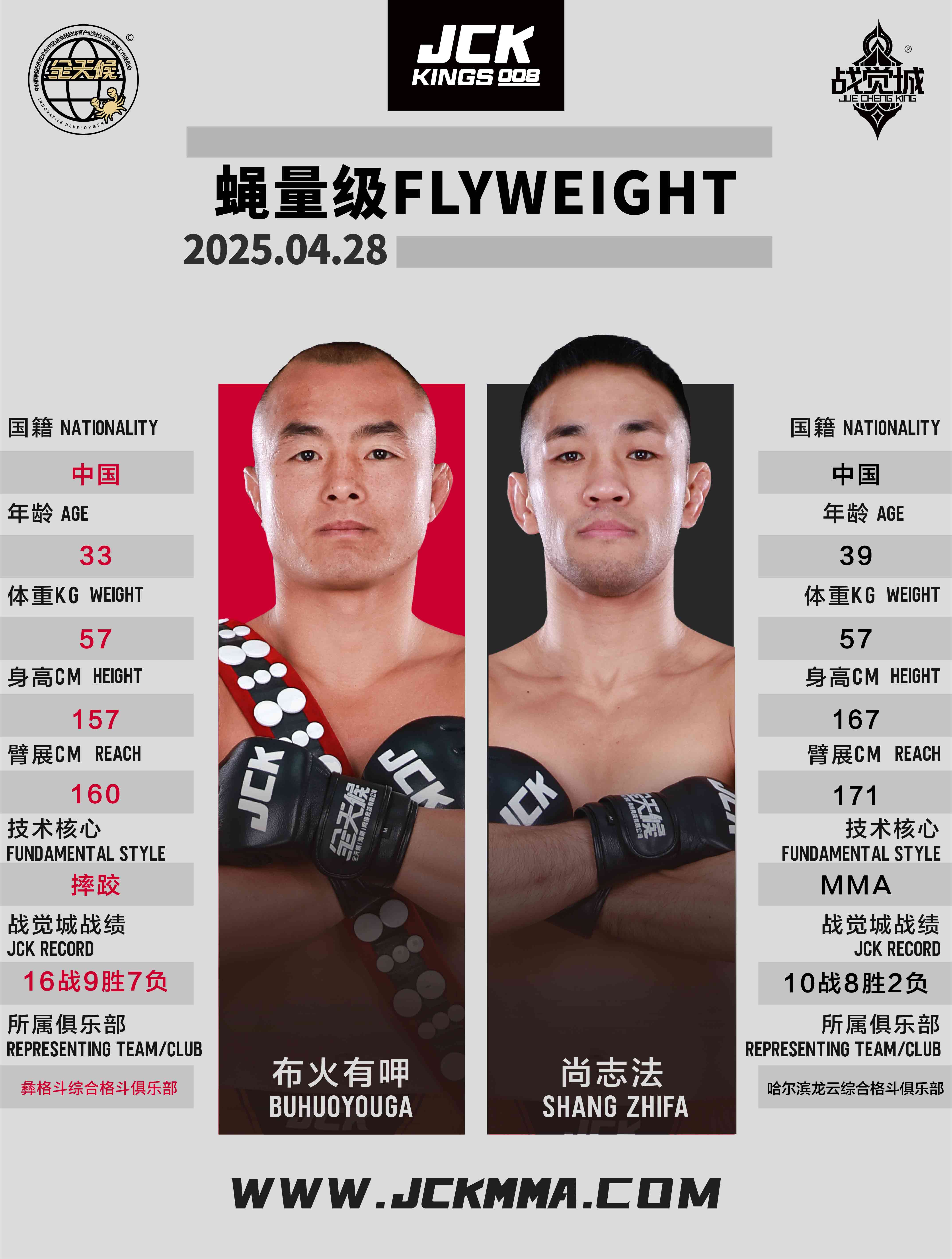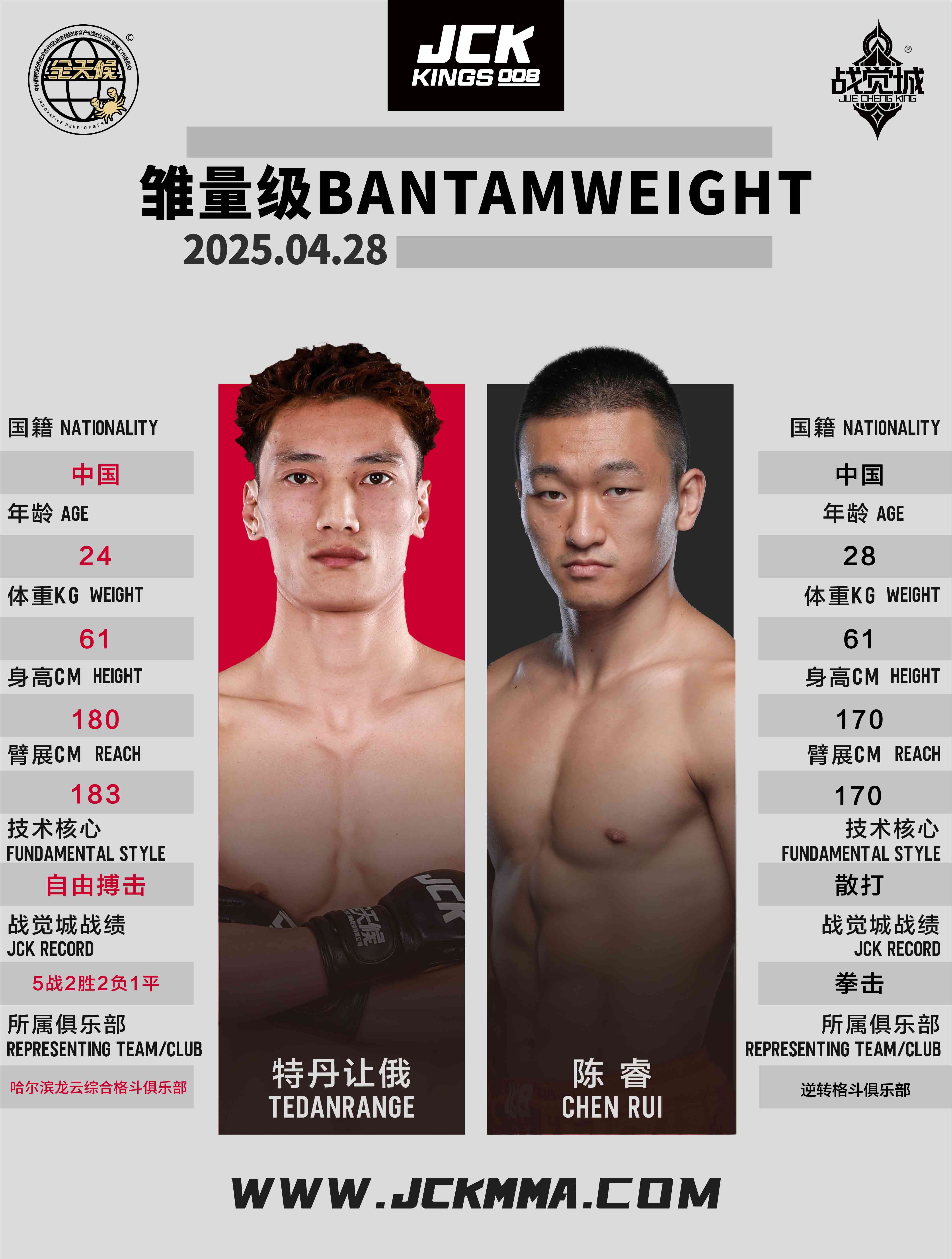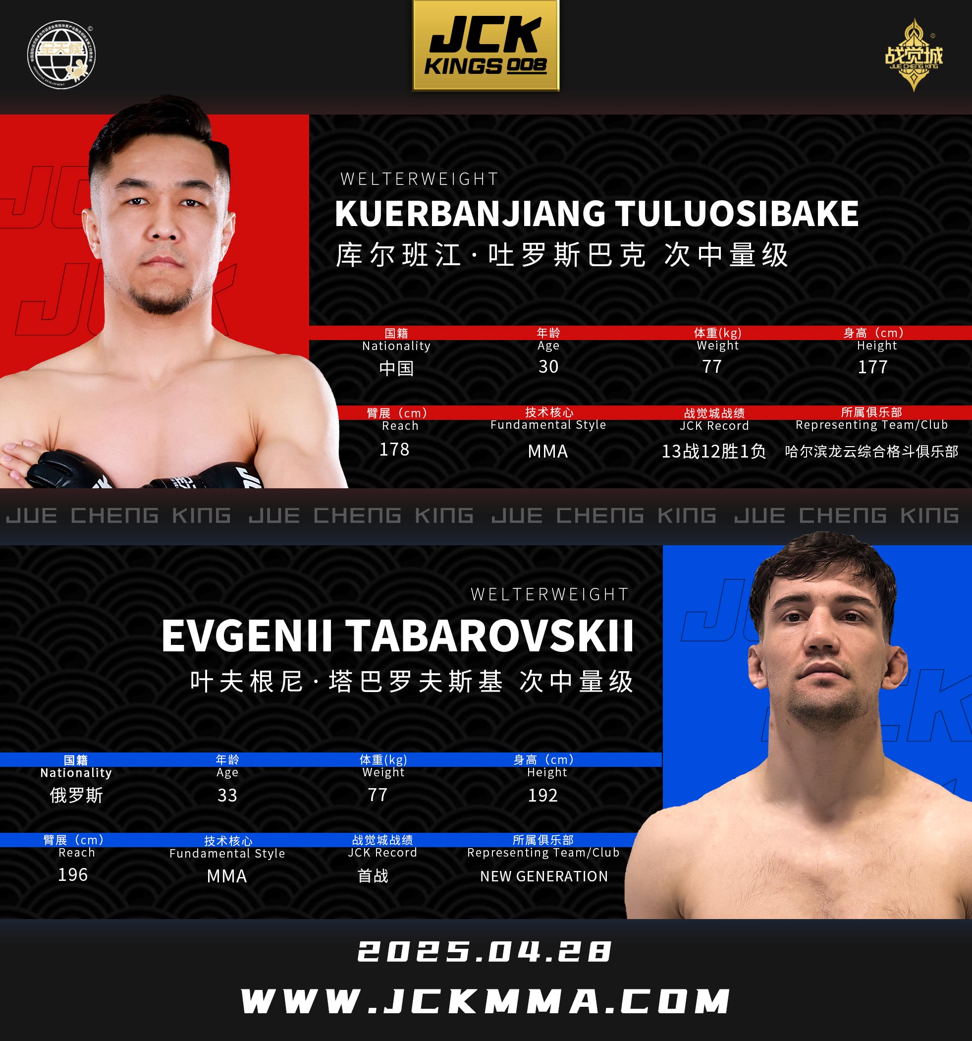 2025年4月28日,“百僑會”JCK戰覺城王者系列008華武元宇聯合賽將在云南省臨滄市體育中心籃球館舉行,這是JCK戰覺城數字賽首次以聯合賽的形式在國內呈現。頭條主賽“雙百萬冠軍”庫爾班江·吐羅斯巴克迎戰俄羅斯冠軍選手葉夫根尼·塔巴羅夫斯基;聯合主賽布火有呷與尚志法爭奪蠅量級金腰帶挑戰權;正賽部分趙志康對戰吉爾吉斯斯坦冠軍朱爾迪茲別克·烏魯·西米克別克、尼格單迎來俄羅斯冠軍扎云丁·蘇萊曼諾夫的挑戰、巴西老將雷吉納爾多·維埃拉與吉爾吉斯斯坦高手魯斯蘭·阿穆耶夫展開激戰。