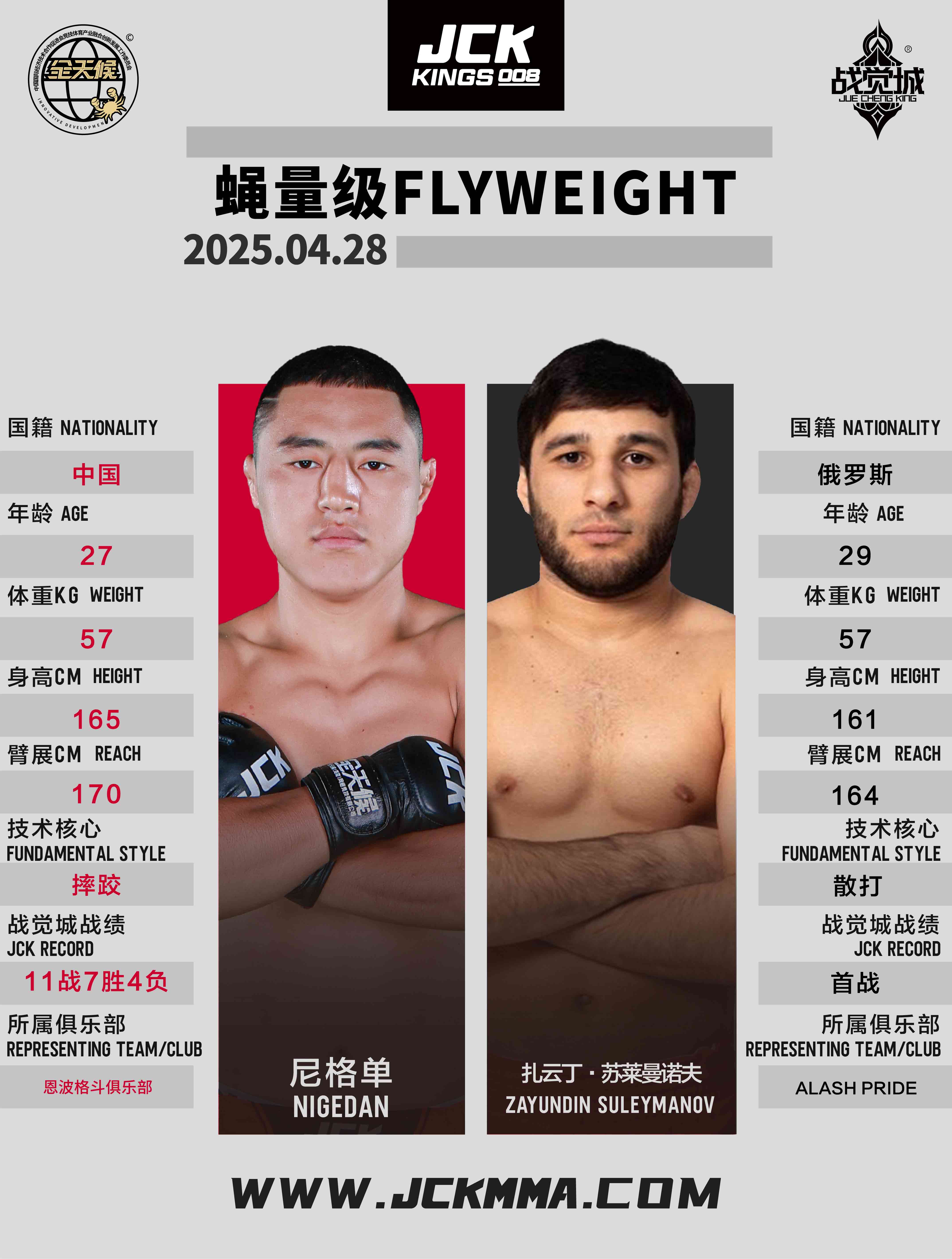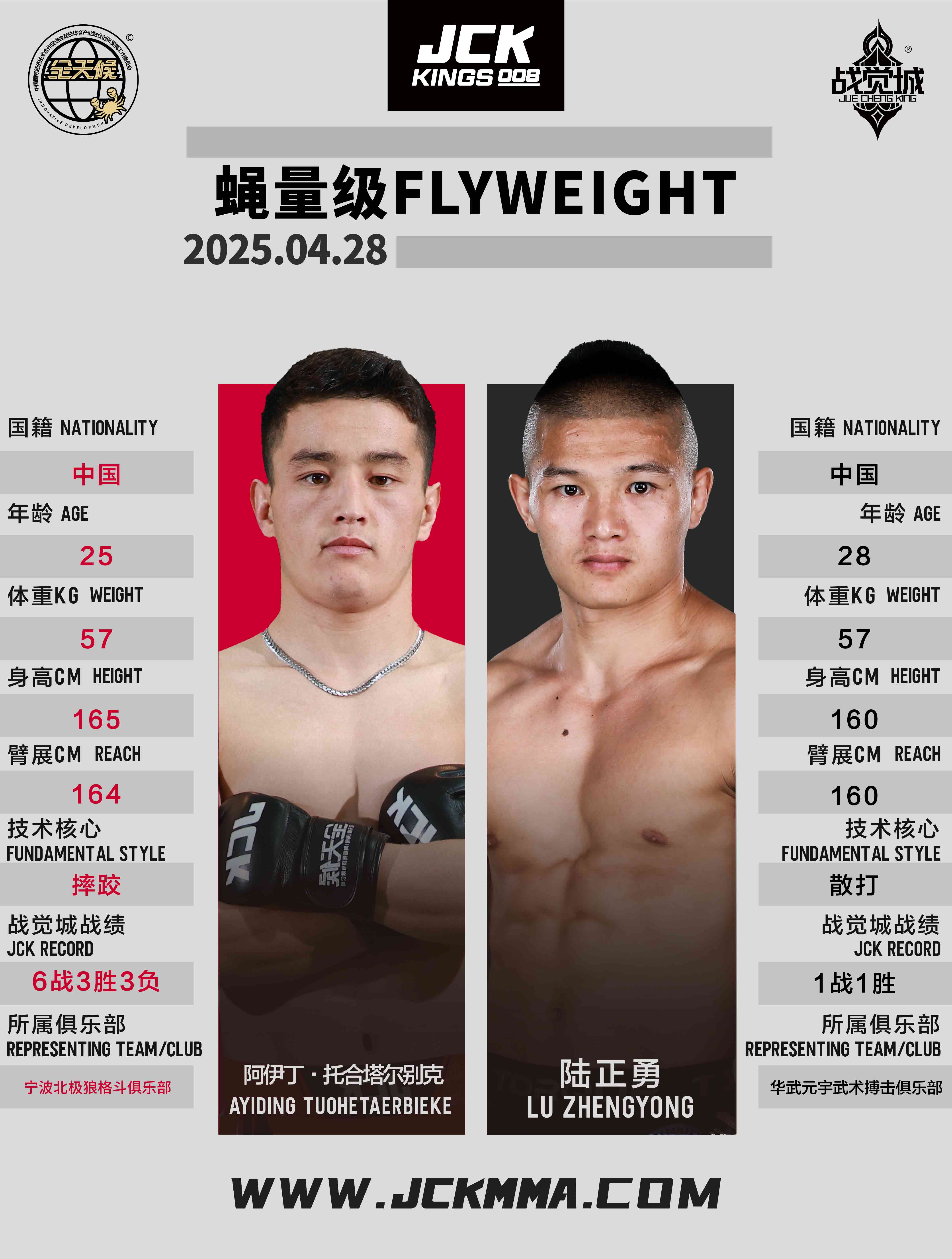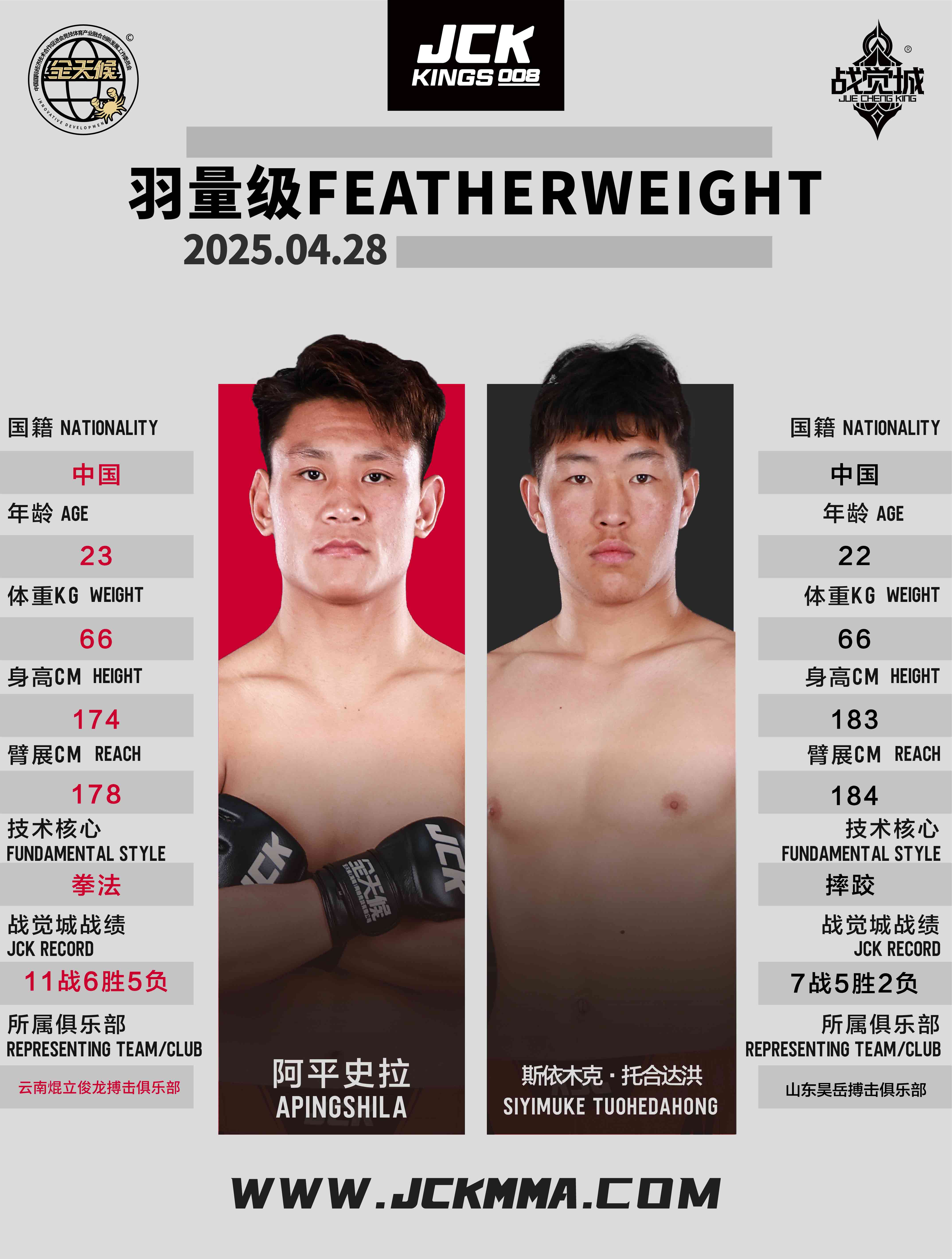 2025年4月28日,“百僑會”JCK戰覺城王者系列008華武元宇聯合賽將在云南省臨滄市體育中心籃球館舉行,這是JCK戰覺城數字賽首次以聯合賽的形式在國內呈現。頭條主賽“雙百萬冠軍”庫爾班江·吐羅斯巴克迎戰俄羅斯冠軍選手葉夫根尼·塔巴羅夫斯基;聯合主賽布火有呷與尚志法爭奪蠅量級金腰帶挑戰權;正賽部分趙志康對戰吉爾吉斯斯坦冠軍朱爾迪茲別克·烏魯·西米克別克、尼格單迎來俄羅斯冠軍扎云丁·蘇萊曼諾夫的挑戰、巴西老將雷吉納爾多·維埃拉與吉爾吉斯斯坦高手魯斯蘭·阿穆耶夫展開激戰。