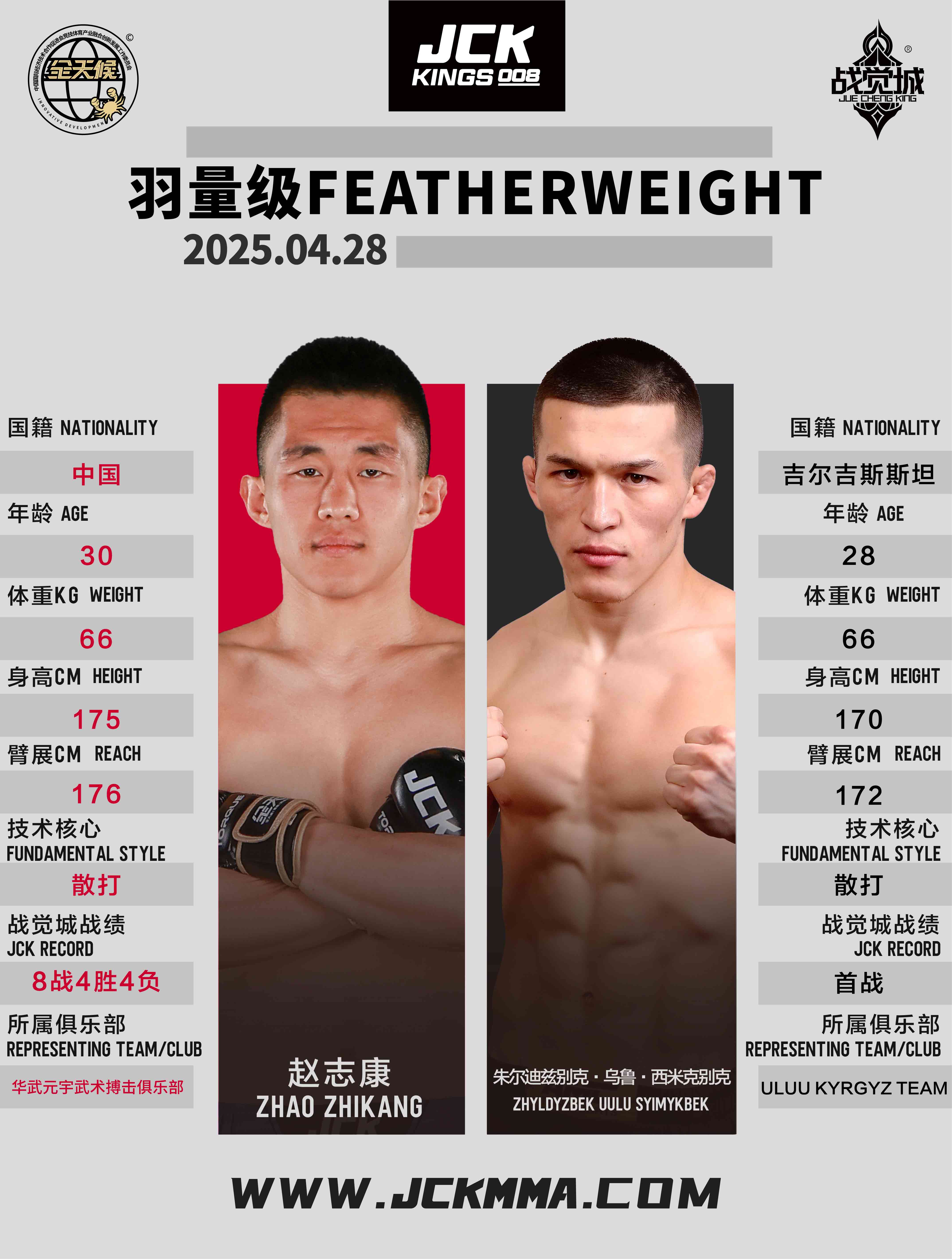 趙志康,JCK戰覺城羽量級官方排名第八,散打名將,纏斗技術可圈可點,目前在JCK戰覺城8戰4勝,當下深陷4連敗的困局。
