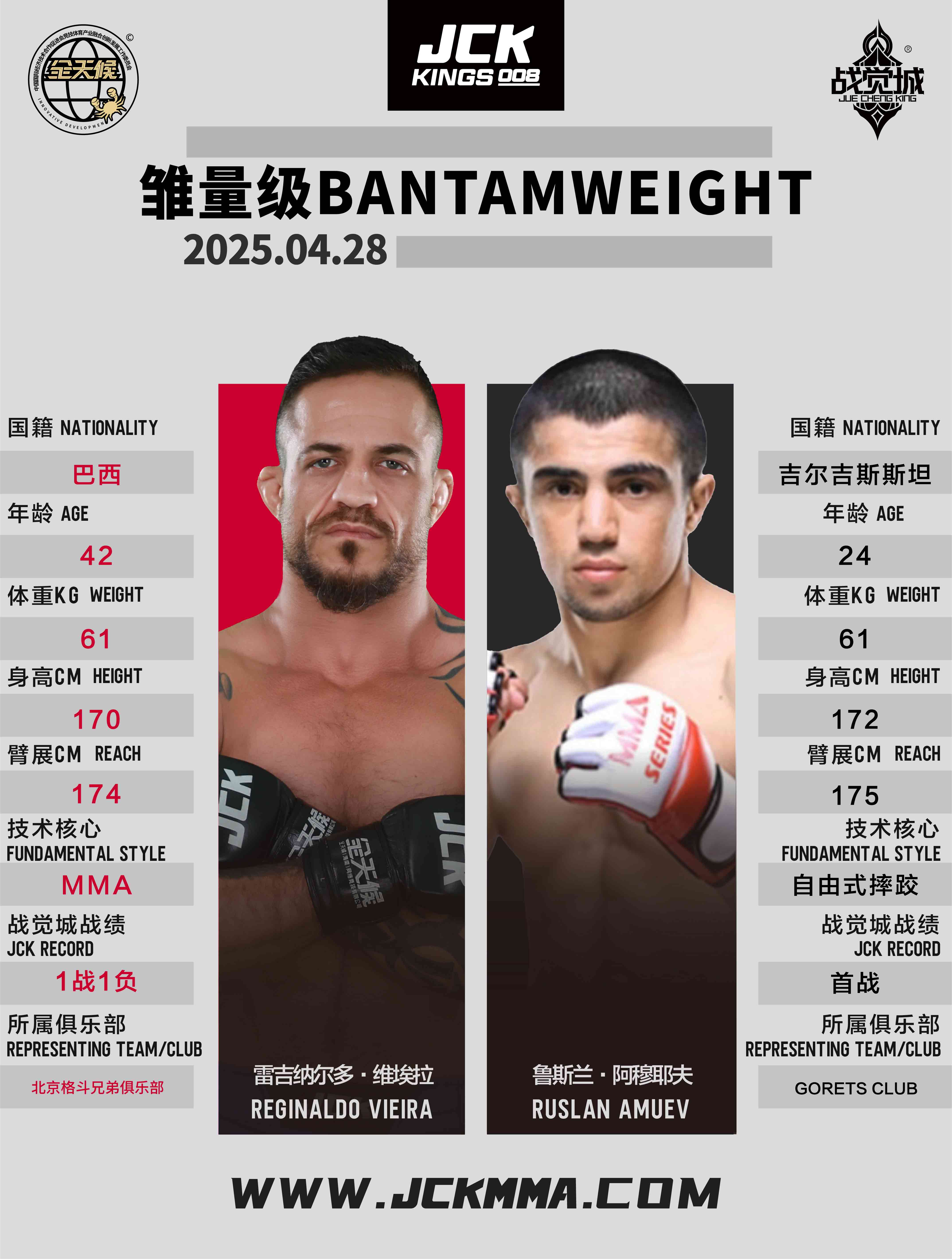 雷吉納爾多·維埃拉,巴西老將,年齡42歲,擁有21戰16勝的職業戰績,在JCK戰覺城的上一場比賽中,他被羽量級“賞金之王”那爾太·克孜巴依以32秒的閃電速度KO。