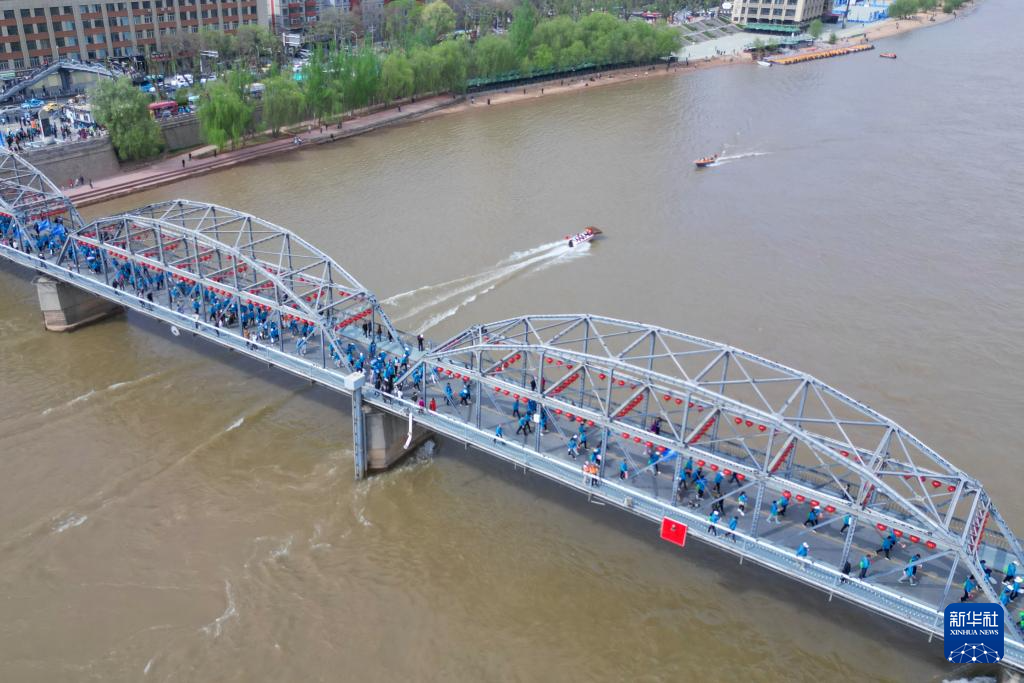 4月25日,蘭州市基層工會的職工代表在健步走活動中經過黃河中山橋(無人機照片)。