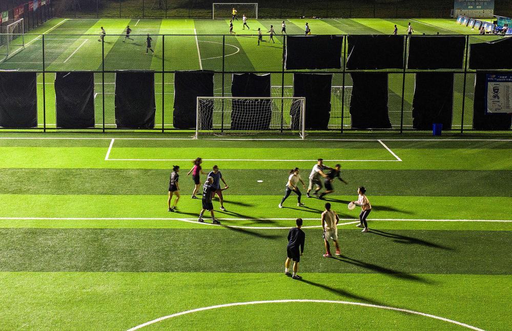 資料圖:市民在成都市錦江體育公園足球場里玩飛盤。新華社記者 江宏景 攝