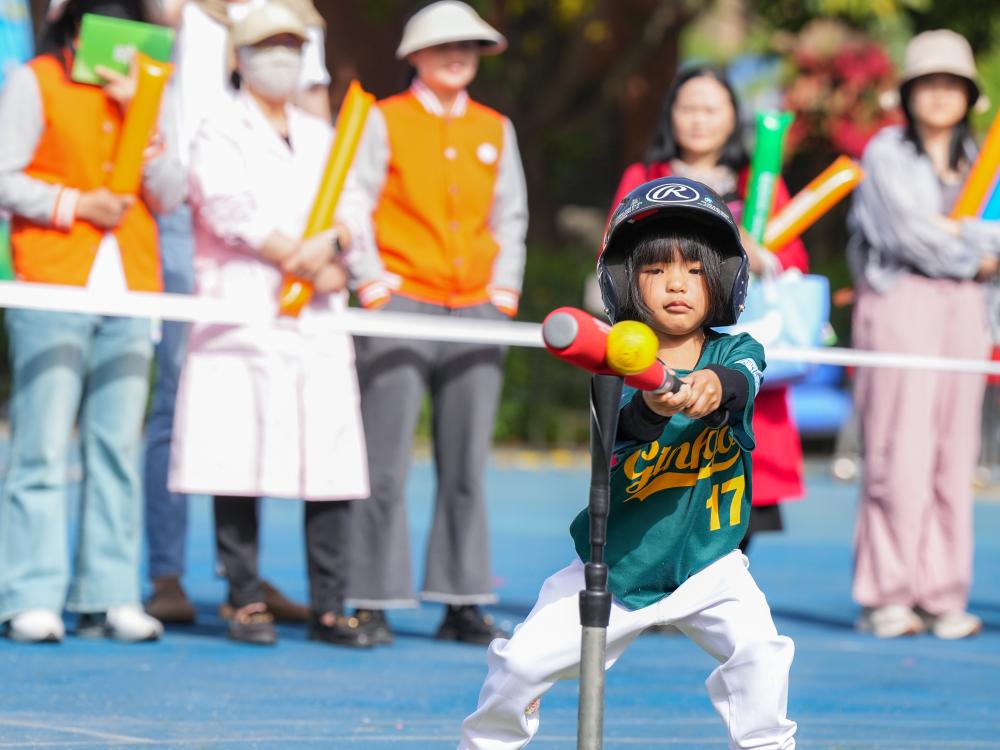 4月13日,成都高新區石羊第六幼兒園的陳徽晗在比賽中擊球。當日,一場幼兒軟式棒壘球賽在成都高新區舉行,來自高新區6所幼兒園的100余名兒童參與角逐,在運動中樂享周末快樂時光。新華社記者 王曦 攝