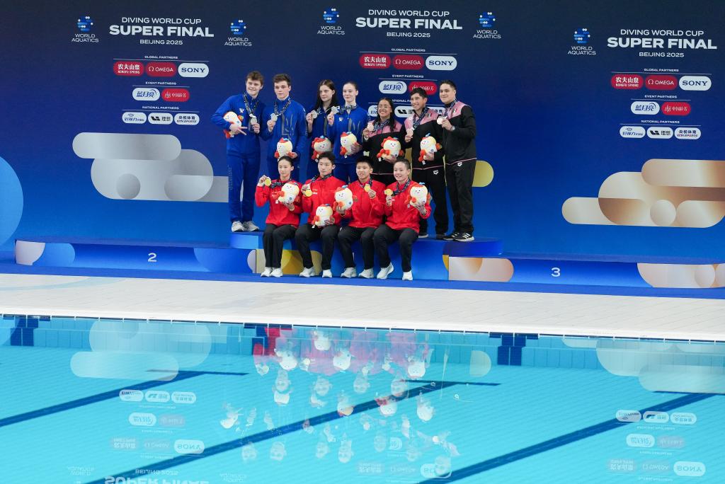 5月2日,在混合團體決賽中,獲得冠軍的中國隊(下)和獲得亞軍的烏克蘭隊(上左)以及獲得季軍的墨西哥隊在頒獎儀式上手持吉祥物合影