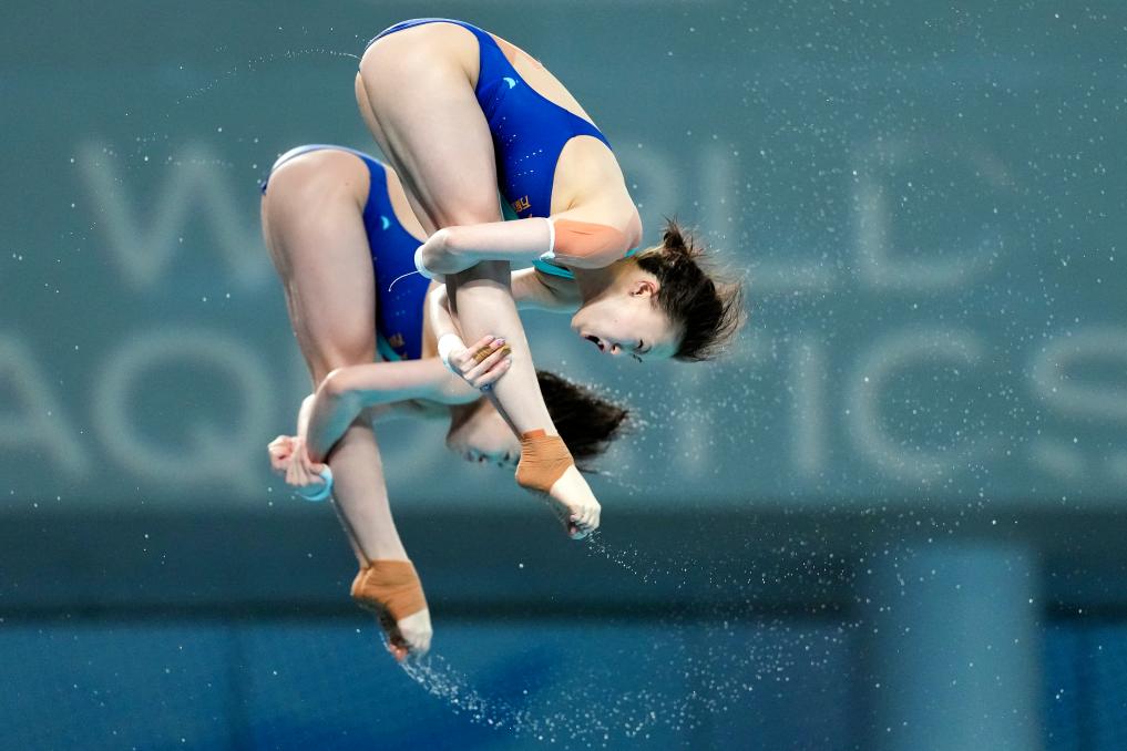 5月2日,中國組合陳芋汐(前)/全紅嬋在2025年世界泳聯跳水世界杯總決賽女子雙人10米臺決賽中
