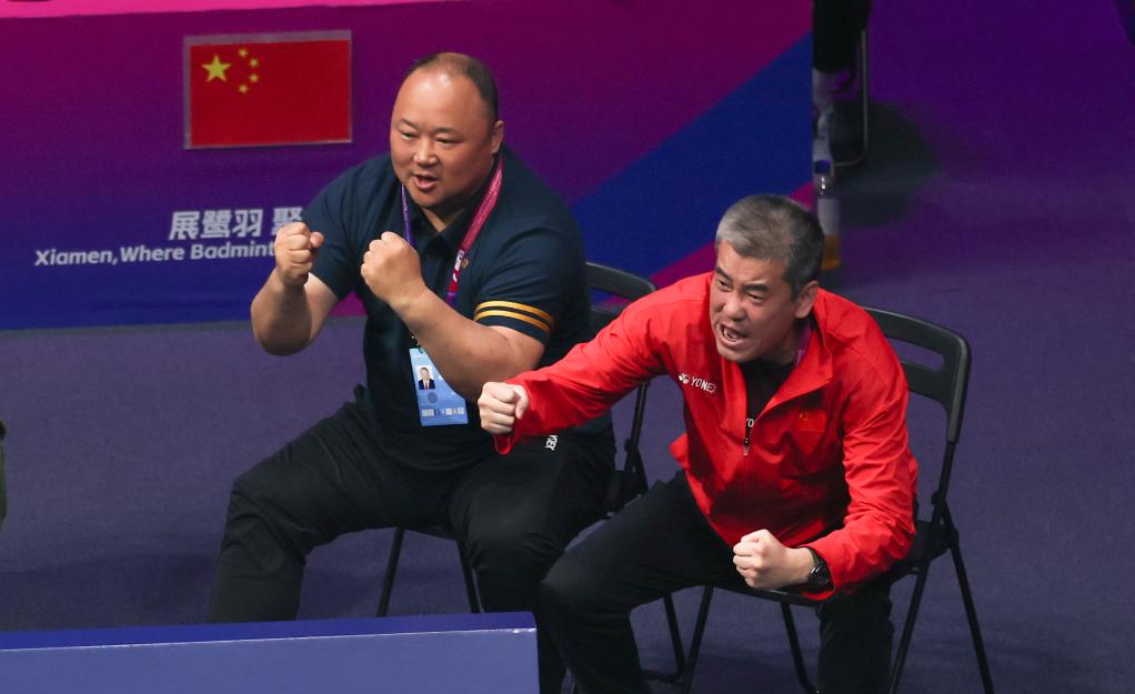5月4日,中國羽毛球協會主席張軍(左)和中國隊教練楊明在為中國隊加油。