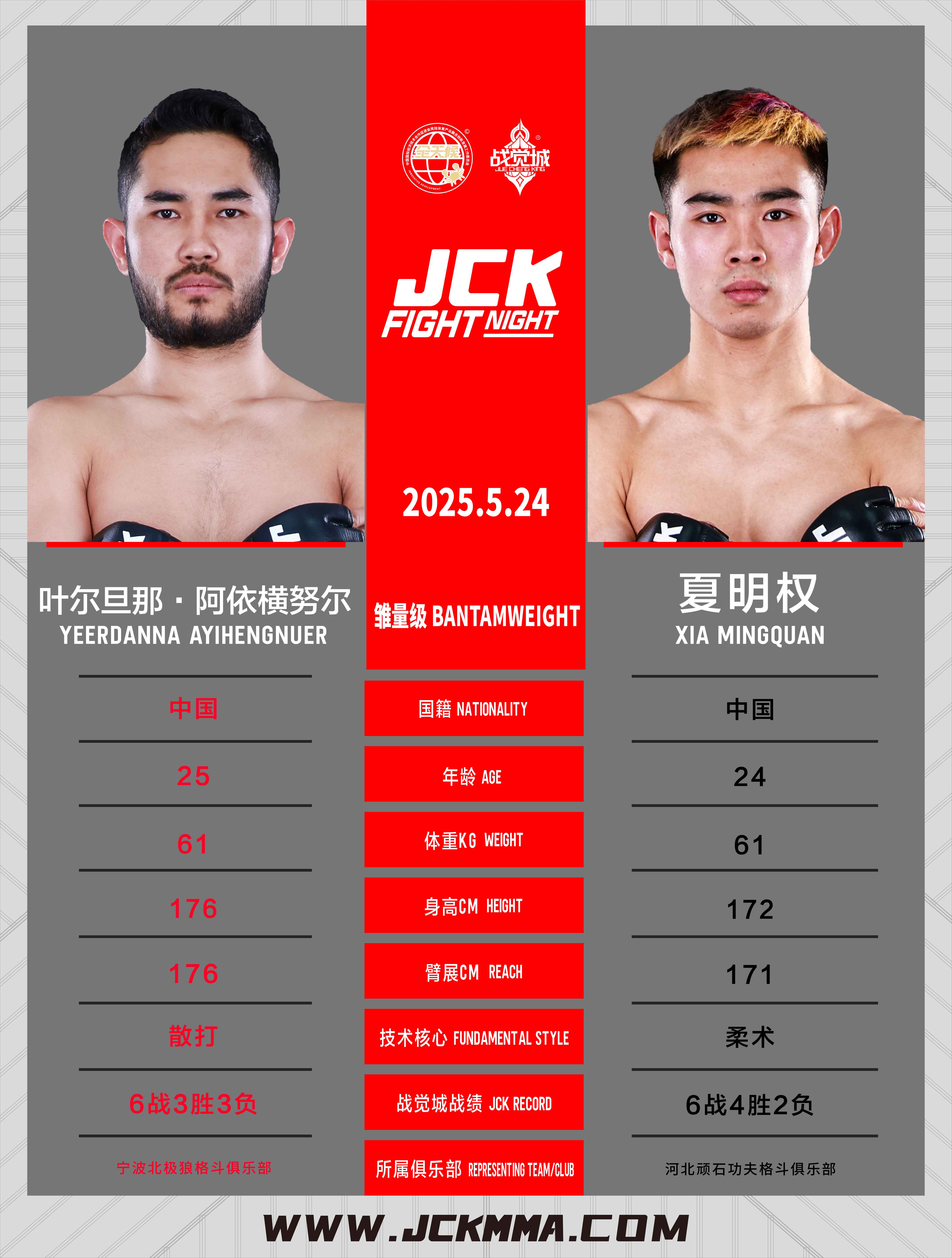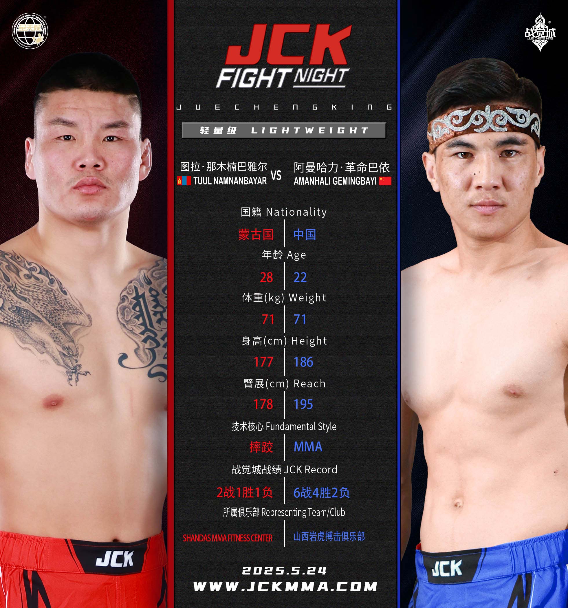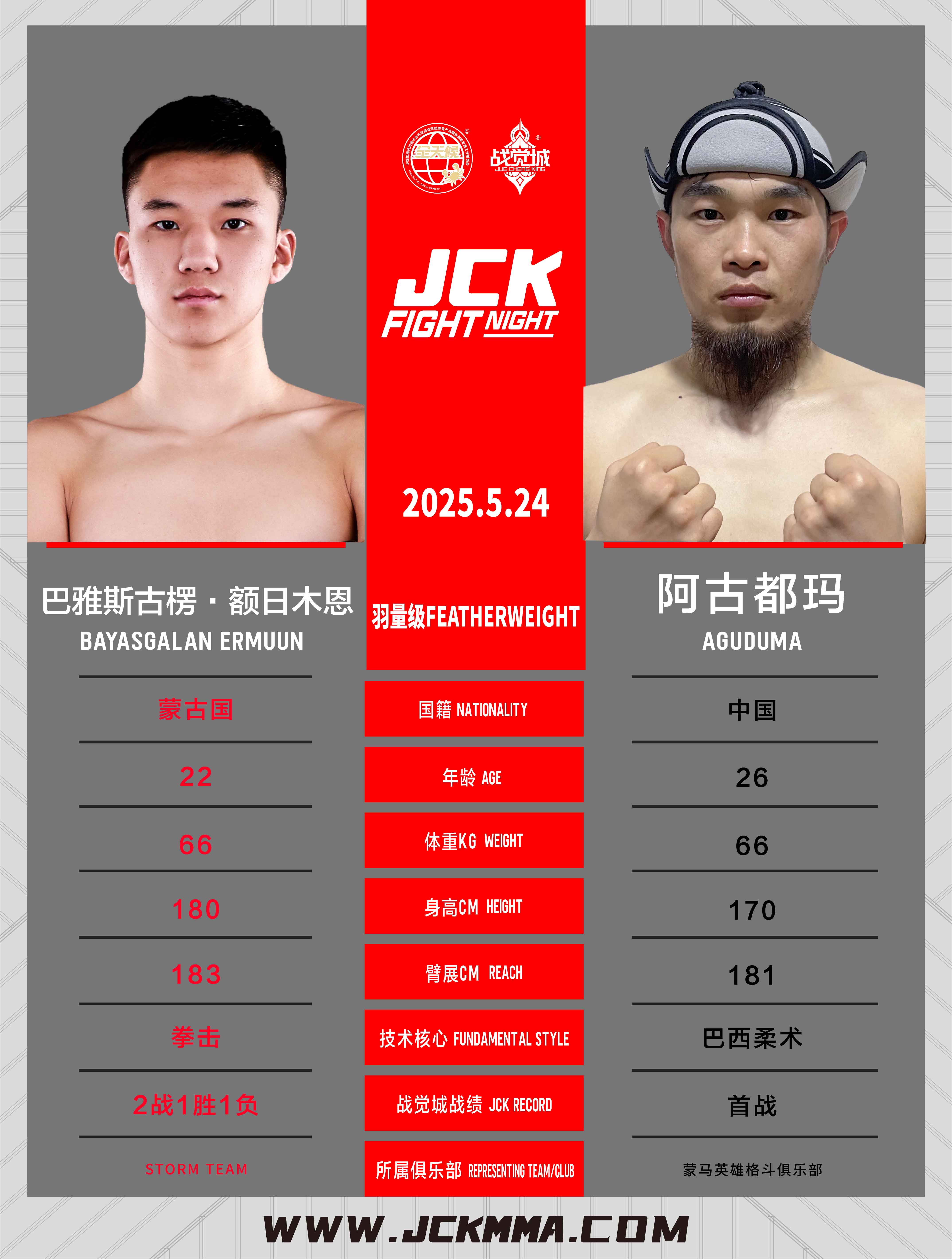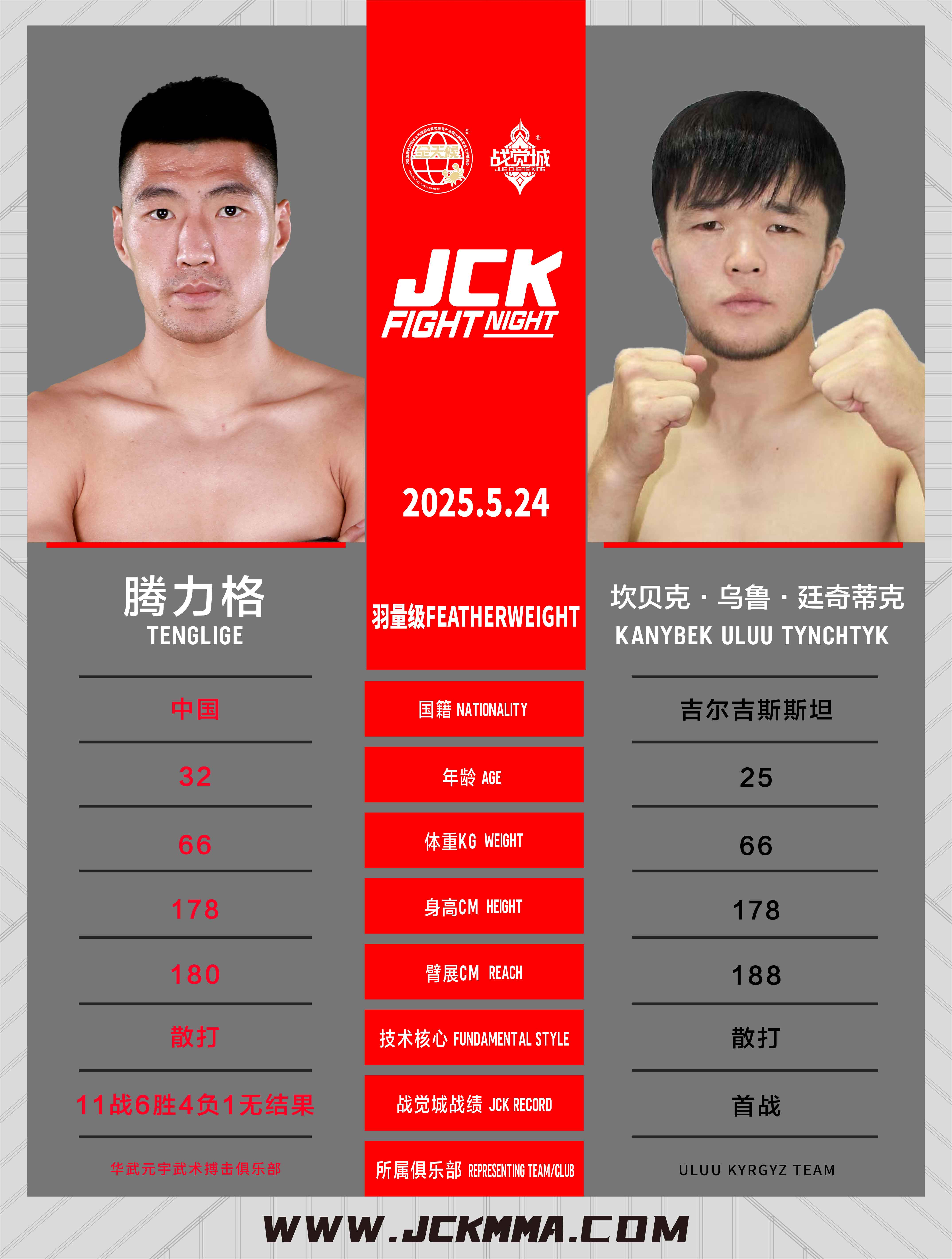 2025年5月24日,JCK覺城之夜N99將在山西交城JCK戰覺城國際格斗中心開戰,頭條主賽圖拉·那木楠巴雅爾對戰阿曼哈力·革命巴依,聯合主賽王奇迎戰阿庫諾夫·努爾日吉特,正賽部分,騰力格VS坎貝克·烏魯·廷奇蒂克、葉爾旦那·阿依橫努爾VS夏明權、張帥VS布火古補、阿弟VS高俊野。