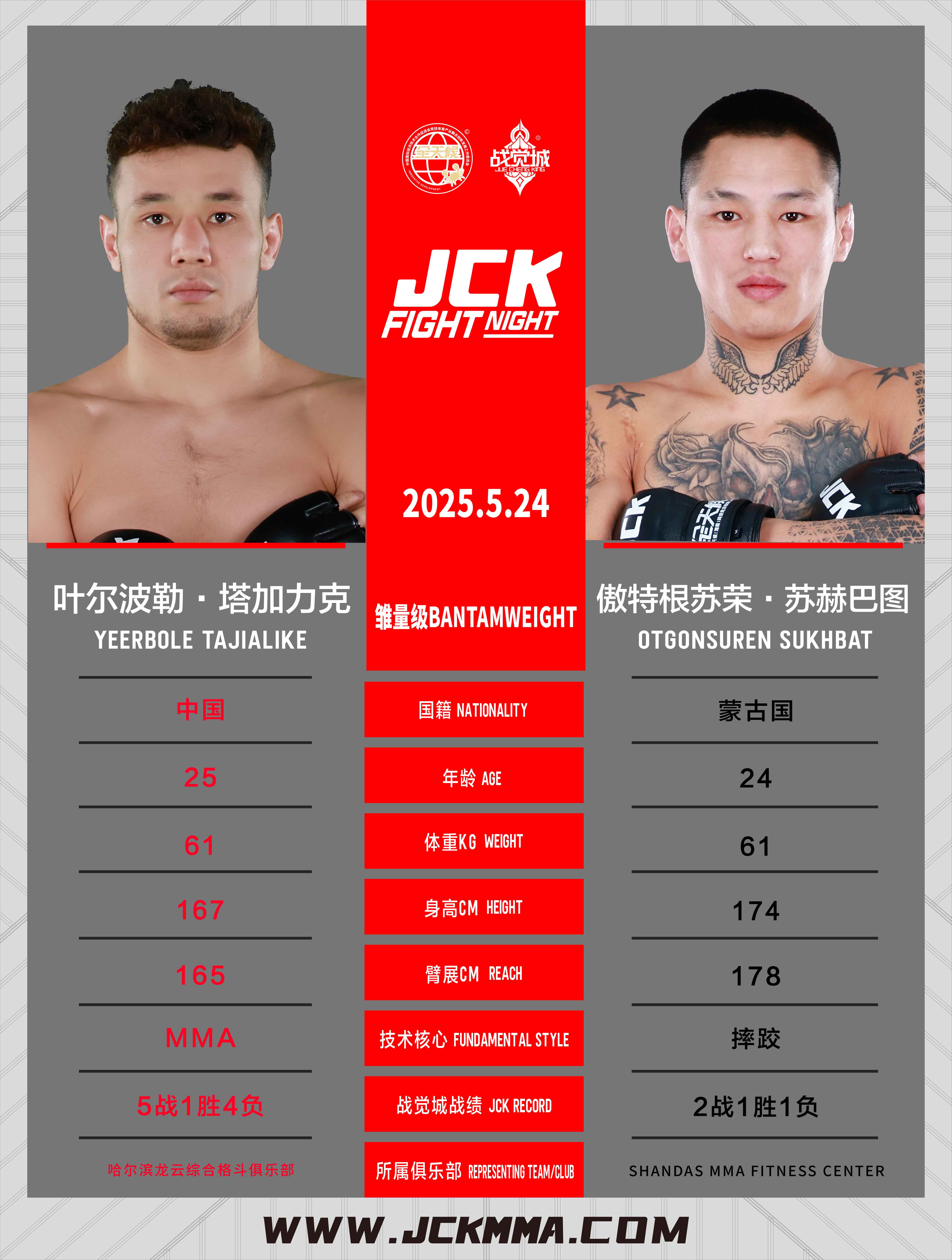 傲特根蘇榮·蘇赫巴圖,技術核心:摔跤,在JCK戰覺城2戰1勝,曾首回合TKO努爾加那提·朱馬依。