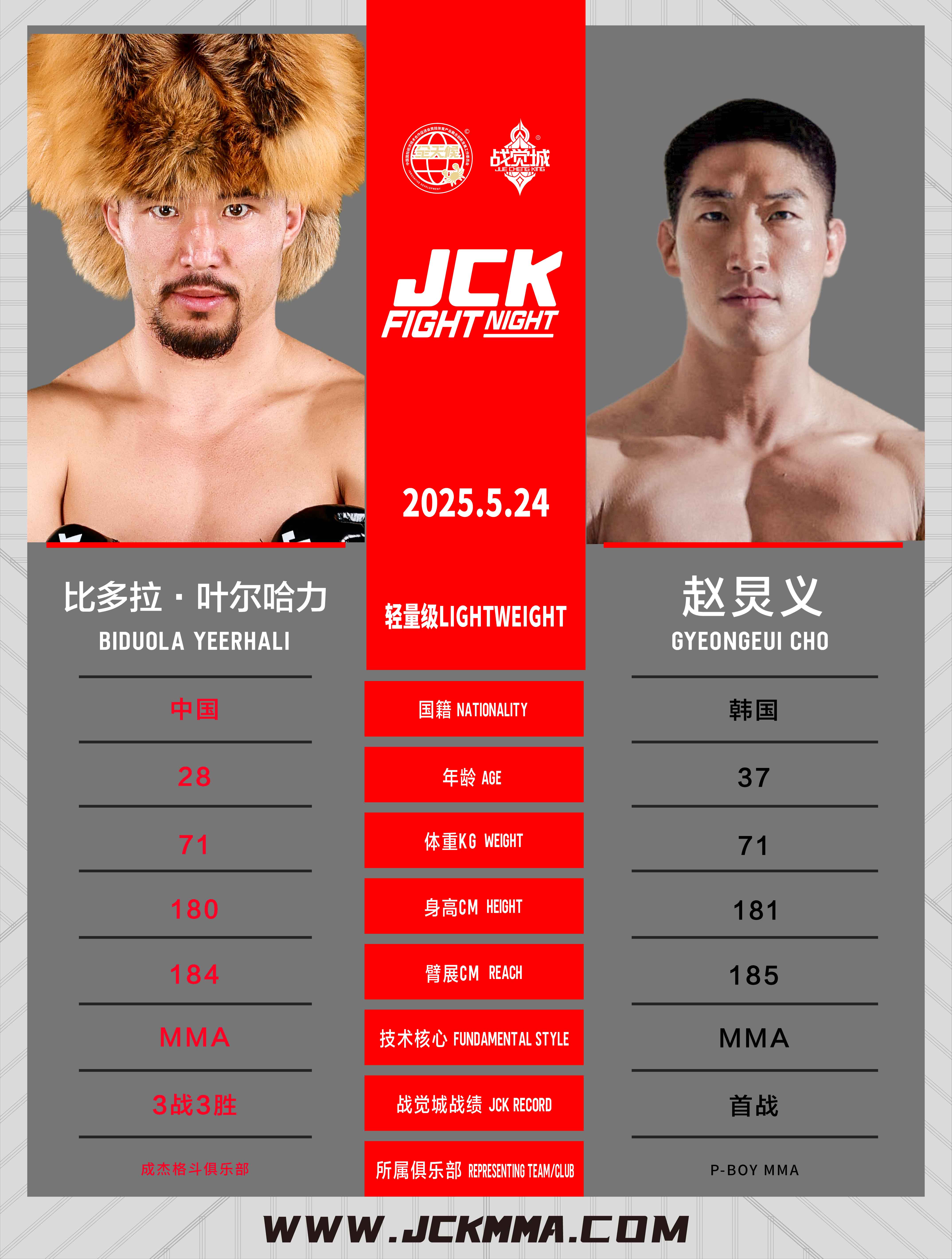 比多拉·葉爾哈力,在JCK戰覺城3戰3勝,未嘗敗績,曾背后裸絞降服烏日根巴雅爾,TKO??′?、葉爾達吾列提·阿亞提,他在JCK戰覺城的3場勝場均首回合終結。