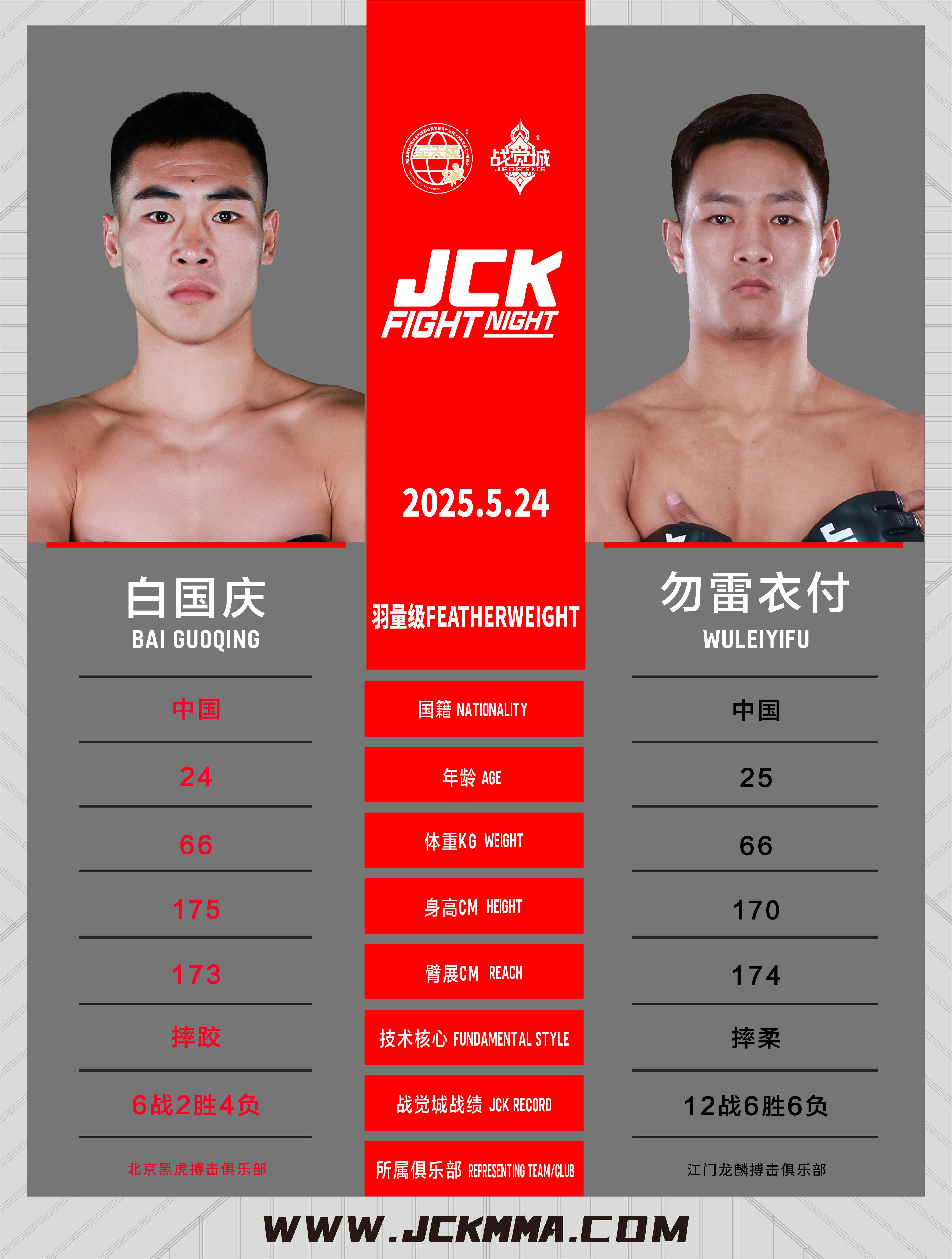 勿雷衣付,JCK覺城之夜N68四人新銳賽冠軍,技術核心:摔柔,在JCK戰覺城12戰6勝,曾背后裸絞降服張彪,一致判定戰勝阿拉騰布日格德、彭爽,TKO艾地汗木·惡拉木。