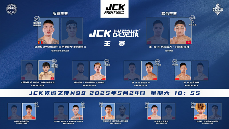 2025年5月24日,JCK覺城之夜N99結束,頭條主賽圖拉·那木楠巴雅爾背后裸絞降服阿曼哈力·革命巴依;聯合主賽阿庫諾夫·努爾日吉特一致判定戰勝王奇;正賽部分坎貝克·烏魯·廷奇蒂克背后裸絞降服騰力格,夏明權、布火古補、阿弟均TKO獲勝;副賽部分勿雷衣付、巴雅斯古楞·額日木恩分別TKO白國慶、阿古都瑪,向光偉一致判定戰勝賈金搏,傲特根蘇榮·蘇赫巴圖、比多拉·葉爾哈力均背后裸絞降服取勝。