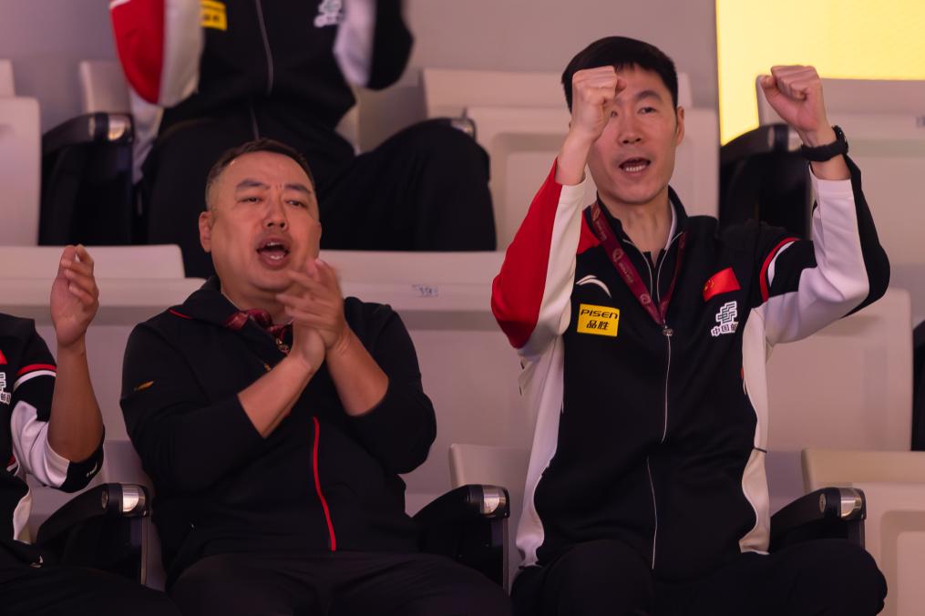 ↑王勵勤(右)與劉國梁在看臺上觀賽