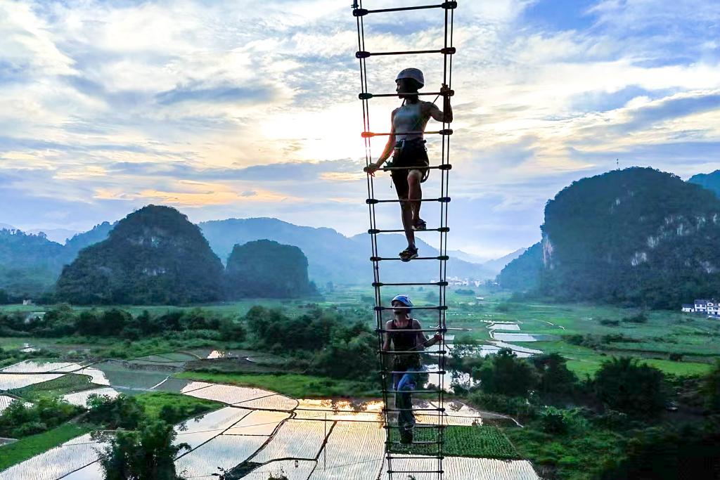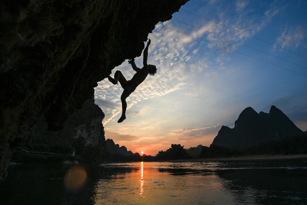 ↑攀巖愛好者在廣西桂林體驗攀巖