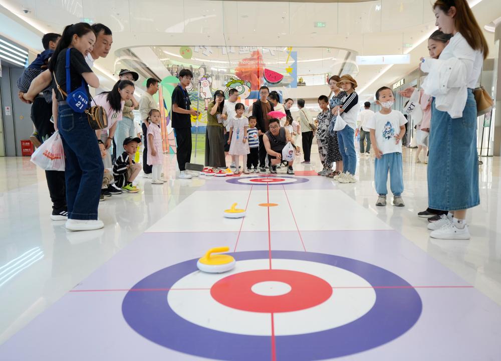 5月31日,市民在活動現場參加大眾旱地冰壺挑戰賽。端午節當日,2025年寧夏“體育賽事進景區、進街區、進商圈”系列活動暨全國大學生三人籃球邀請賽在銀川市金鳳區悠閱城開幕。新華社記者 王鵬 攝