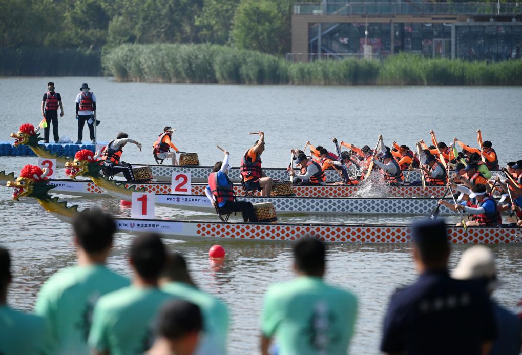 5月24日,參賽隊伍在2025年天津港保稅區龍舟大賽比賽中。新華社記者 趙子碩 攝