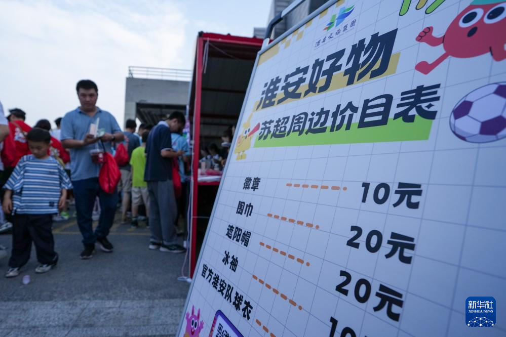 6月14日,球迷在江蘇淮安“蘇超”市集選購各類賽事周邊產品。