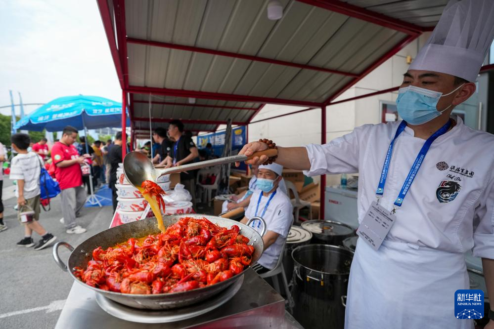 6月14日,一名廚師在江蘇淮安“蘇超”市集制作小龍蝦。