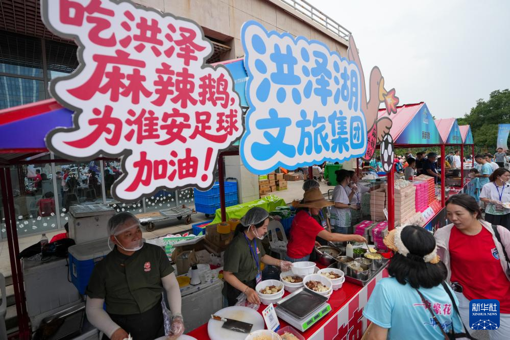 6月14日,球迷在江蘇淮安“蘇超”市集品嘗美食特產。