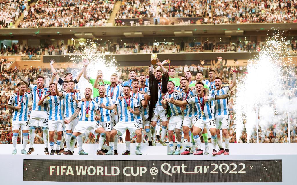 2022年12月18日,阿根廷隊球員在頒獎儀式上慶祝。當日,在卡塔爾盧賽爾球場進行的2022卡塔爾世界杯足球賽決賽中,阿根廷隊與法國隊在常規時間和加時賽戰成3比3平,通過點球大戰阿根廷隊以總比分7比5獲勝,奪得冠軍。新華社記者 李明 攝